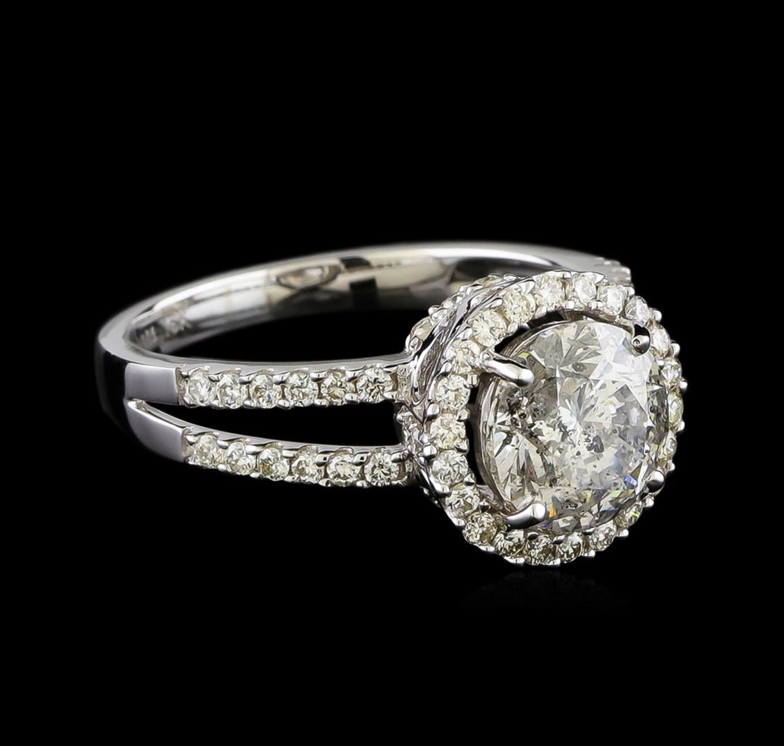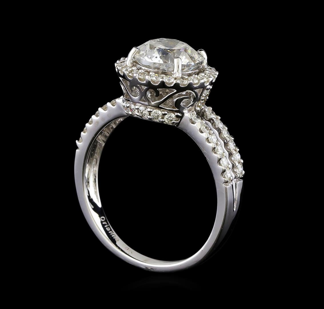 One electronically tested 18KT white gold ladies cast diamond unity ring with a bright polish finish. The featured diamond is set within a diamond bezel supported by a diamond set under gallery and diamond set split shoulders, completed by a two millimeter wide band. Trademark is Orianne. Identified with markings of "18K". Condition is new, good workmanship. Containing: One prong set round brilliant cut diamond, measuring 8.05 - 8.00 x 5.09mm (depth est.), 8.00.%. GTCF approximate weight of 2.20ct with a faint blue fluorescence. Graded in the setting. Clarity: I-2. Color: G. Depth 63.4%. Table 54.8%. Sixty prong set round brilliant cut diamonds approximate total weight of 60 Stones = 0.61ct. Graded in the setting. Clarity: I-1 to I-2. Color: G - I. Total Weight of Diamonds 2.81ct. Total Weight of Ring 4.53gm. AIG Appraised at $20,810.00.