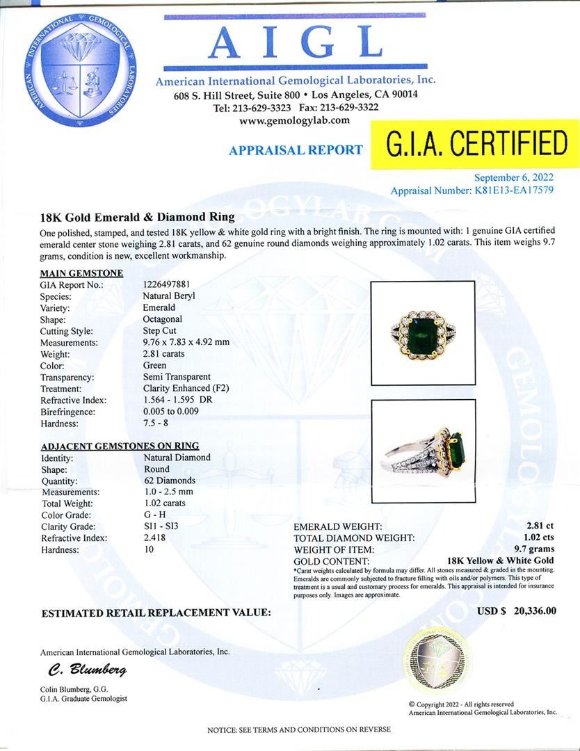 2.81ct Emerald and 1.02ctw Diamond 18K Yellow and White Gold Ring (GIA CERTIFIED). One polished, stamped, and tested 18K yellow and white gold ring with a bright finish. The ring is mounted with: I genuine GIA certified emerald center stone weighing 2.81 carats, and 62 genuine round diamonds weighing approximately 1.02 carats. This item weighs 9.7 grams, condition is new, excellent workmanship. MAIN GEMSTONE GIA Report No.: 1226497881 Species: Natural Beryl Variety: Emerald Shape: Octagonal Cutting Style: Step Cut Measurements: 9.76 x 7.83 x 4.92mm Weight: 2.81 carats Color: Green Transparency: Semi Transparent Treatment: Clarity Enhanced (F2) Refractive Index: 1.564 - 1.595 DR Birefringence: 0.005 to 0.009 Hardness: 7.5 - 8 ADJACENT GEMSTONES ON RING Identity: Natural Diamond Shape: Round Quantity: 62 Diamonds Measurements: 1.0 - 2.5mm Total Weight: 1.02 carats Color Grade: G - H Clarity Grade: SI1-SI3 Refractive Index: 2.418 Hardness: 10 EMERALD WEIGHT: 2.81 ct TOTAL DIAMOND WEIGHT: 1.02 cts WEIGHT OF ITEM: 9.7 grams GOLD CONTENT: 18K Yellow and White Gold