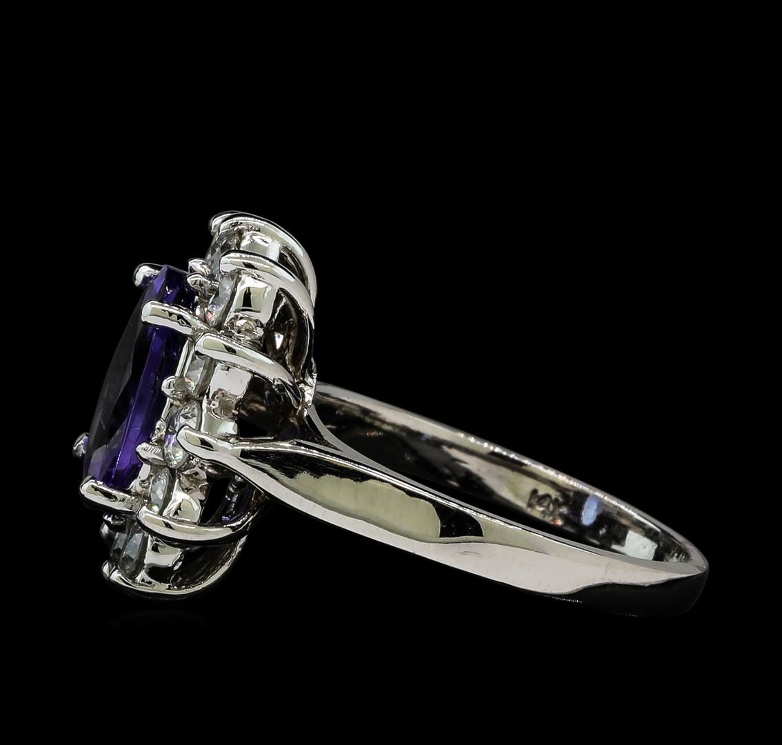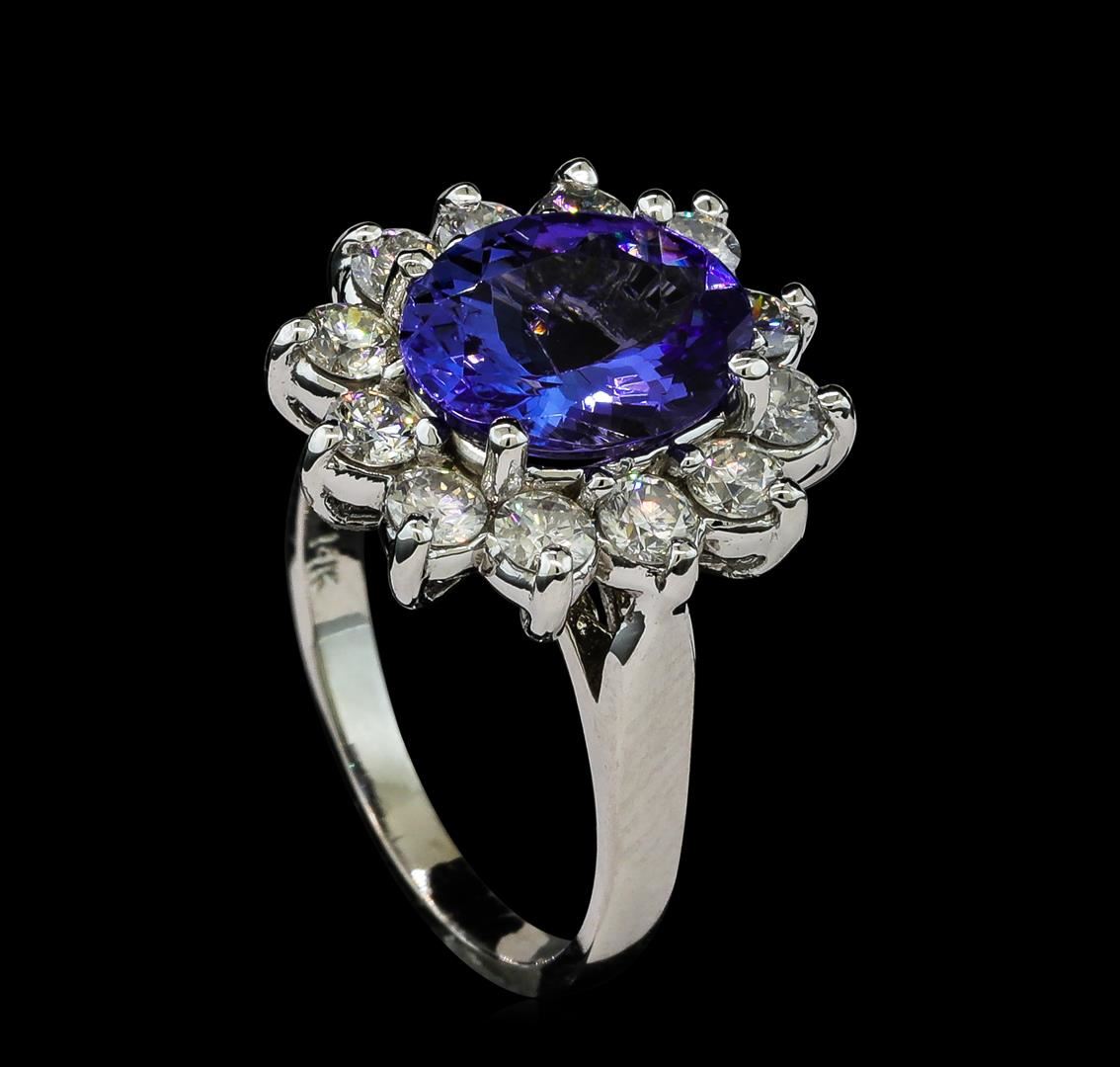 One electronically tested 14KT white gold lady's cast fashion ring with a basket halo with a bright polish finish. The featured lady's ring has a shank measuring 2.05 millimeters wide. Identified with markings of '14K'. Condition is new, good workmanship. Containing: One prong set oval modified brilliant cut natural tanzanite, measuring 10.50 x 8.45 x 4.98mm, (depth est.) approximate weight of 2.81ct., clarity is eye clean, medium dark, very slightly grayish, violetish blue color, (GIA vB 6/3), cut is very good. Transmitting light with no distortion, transparent. Colored gemstones are presumed to have been subjected to commonly used enhancement processes. Graded in the setting. Twelve prong set round brilliant cut diamonds, measuring 2.95 - 2.85 x 1.80mm (depth est.) approximate total weight of 12 Stones = 1.10ct. Graded in the setting. Clarity VS-2 to SI-2. Color: H - J Cut Good. Total Weight of Colored Stones 2.81ct.. Total Weight of Diamonds 1.10ct.. Total Weight of Ring 5.70gm. GAS Appraised at $7,630.00.