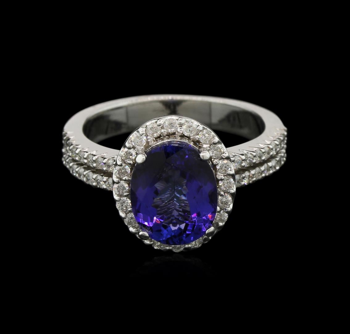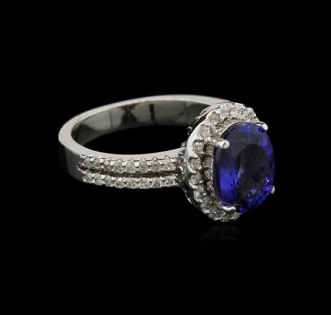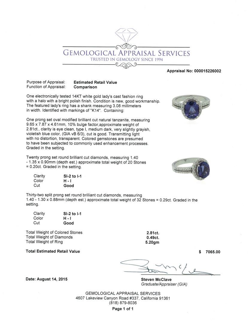 One electronically tested 14KT white gold lady's cast fashion ring with a halo with a bright polish finish. The featured lady's ring has a shank measuring 3.08 millimeters in width. Identified with markings of "K14". Condition is new, good workmanship. Containing: One prong set oval modified brilliant cut natural tanzanite, measuring 9.65 x 7.87 x 4.61mm, 10% bulge factor, approximate weight of 2.81ct., clarity is eye clean, type I, medium dark, very slightly grayish, violetish blue color, (GIA vB 6/3), cut is good. Transmitting light with no distortion, transparent. Colored gemstones are presumed to have been subjected to commonly used enhancement processes. Graded in the setting. Twenty prong set round brilliant cut diamonds, measuring 1.40 - 1.35 x 0.90mm (depth est.) approximate total weight of 20 Stones = 0.20ct. Graded in the setting. Clarity: SI-2 to I-1. Color: H - I. Cut Good Thirty-Two split prong set round brilliant cut diamonds, measuring 1.40 - 1.30 x 0.88mm (depth est.) approximate total weight of 32 Stones = 0.29ct. Graded in the setting. Clarity: SI-2 to I-1. Color: H - I. Cut Good. Total Weight of Colored Stones 2.81ct. Total Weight of Diamonds 0.49ct. Total Weight of Ring 5.20gm. GAS Appraised at $7,065.00.