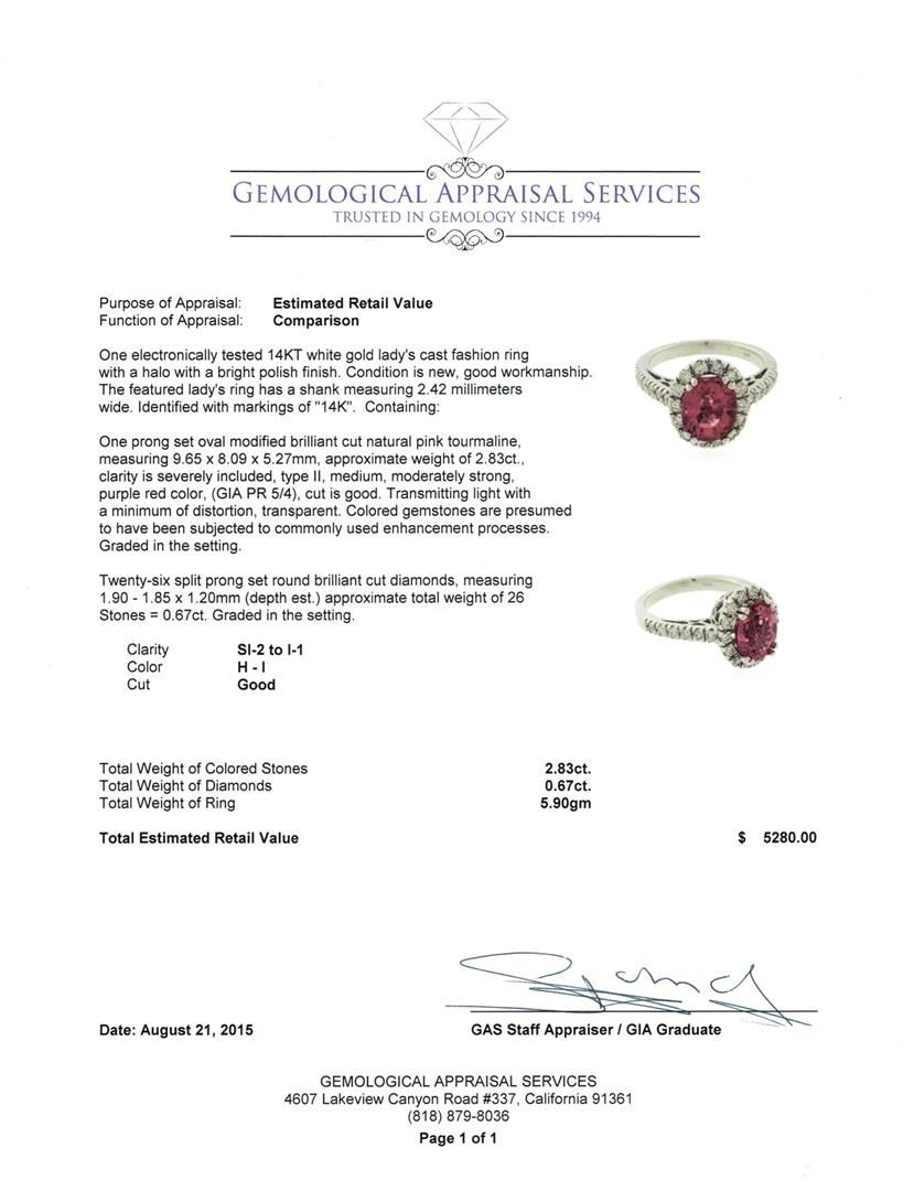 One electronically tested 14KT white gold lady's cast fashion ring with a halo with a bright polish finish. The featured lady's ring has a shank measuring 2.42 millimeters wide. Identified with markings of "14K". Condition is new, good workmanship. Containing: One prong set oval modified brilliant cut natural pink tourmaline, measuring 9.65 x 8.09 x 5.27mm, approximate weight of 2.83ct., clarity is severely included, type II, medium, moderately strong, purple red color, (GIA PR 5/4), cut is good. Transmitting light with a minimum of distortion, transparent. Colored gemstones are presumed to have been subjected to commonly used enhancement processes. Graded in the setting. Twenty-Six split prong set round brilliant cut diamonds, measuring 1.90 - 1.85 x 1.20mm (depth est.) approximate total weight of 26 Stones = 0.67ct. Graded in the setting. Clarity: SI-2 to I-1. Color: H - I. Cut Good. Total Weight of Colored Stones 2.83ct. Total Weight of Diamonds 0.67ct. Total Weight of Ring 5.90gm.