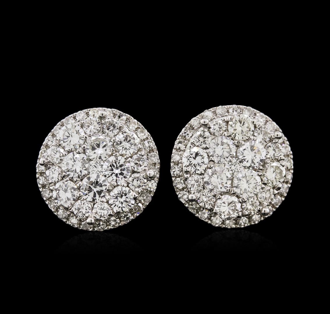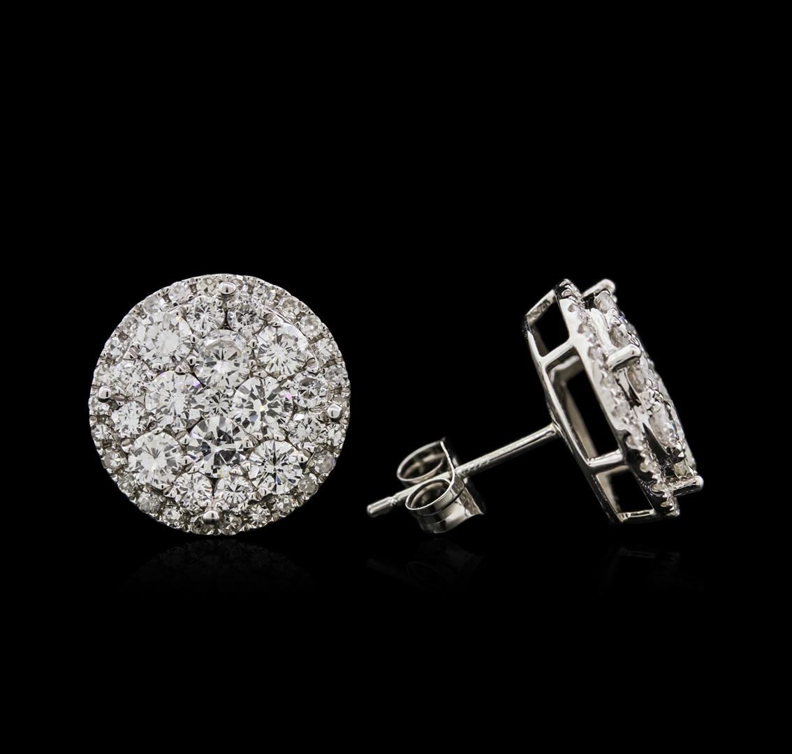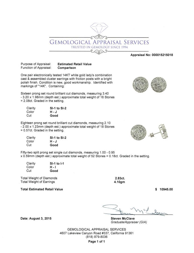 One pair electronically tested 14KT white gold lady's combination cast & assembled cluster earrings with friction posts with a bright polish finish. Identified with markings of "14K". Condition is new, good workmanship. Containing: Sixteen prong set round brilliant cut diamonds, measuring 3.40 - 3.20 x 1.98mm (depth est.) approximate total weight of 16 Stones = 2.08ct. Graded in the setting. Clarity SI-1 to SI-2 Color H - Good Eighteen prong set round brilliant cut diamonds, measuring 2.10 - 2.00 x 1.23mm (depth est.) approximate total weight of 18 Stones = 0.57ct. Graded in the setting. Clarity SI-1 to SI-2 Color H - Good Fifty-Two split prong set single cut diamonds, measuring 1.00 - 0.95 x 0.59mm (depth est.) approximate total weight of 52 Stones = 0.18ct. Graded in the setting. Clarity SI-1 to I-1 Color H - I. Cut Good Total Weight of Diamonds 2.83ct. Total Weight of Earrings 4.10gm GAS Appraised at $10,945.00.