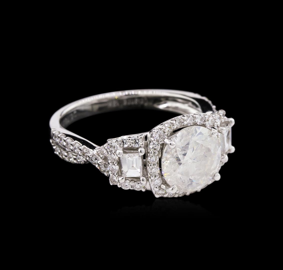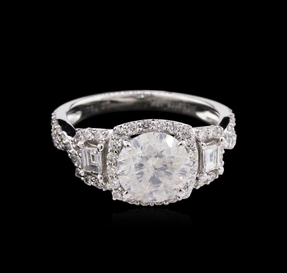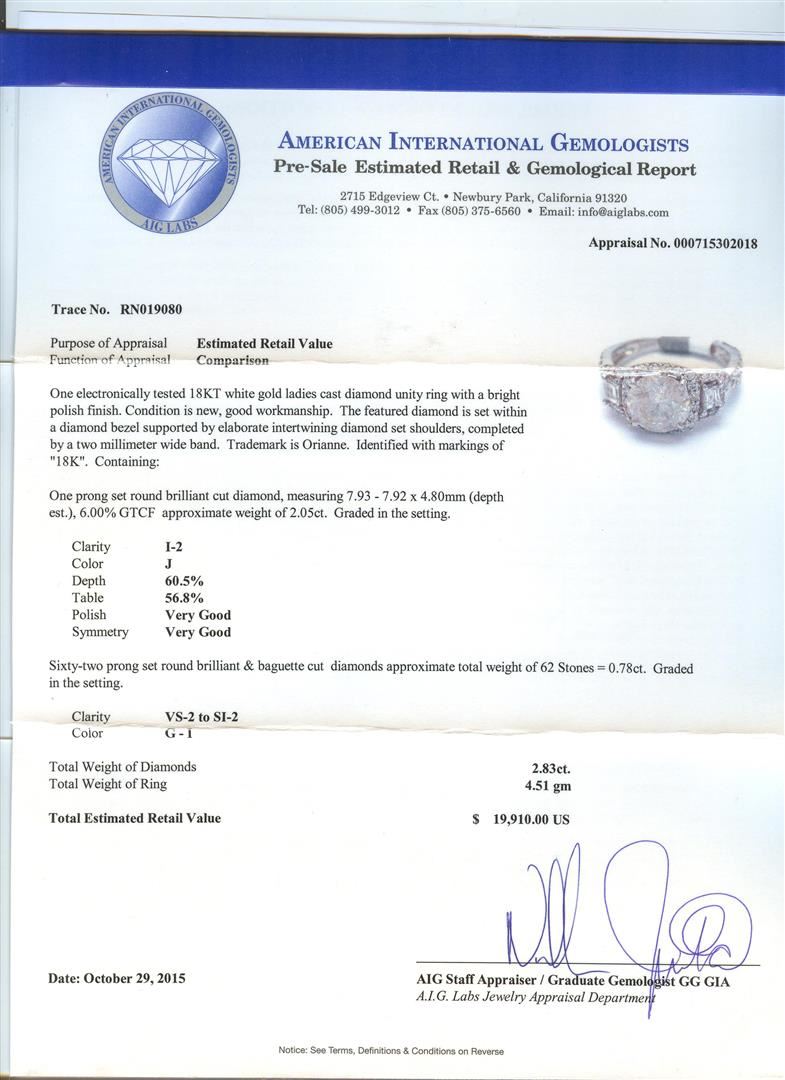 One electronically tested 18KT white gold ladies cast diamond unity ring with a bright polish finish. The featured diamond is set within a diamond bezel supported by elaborate intertwining diamond set shoulders, completed by a two millimeter wide band. Trademark is Orianne. Identified with markings of "18K". Condition is new, good workmanship. Containing: One prong set round brilliant cut diamond, measuring 7.93 - 7.92 x 4.80mm (depth est.), 6.00.%. GTCF approximate weight of 2.05ct. Graded in the setting. Clarity: I-2. Color: J. Depth 60.5%. Table 56.8%. Sixty-Two prong set round brilliant & baguette cut diamonds approximate total weight of 62 Stones = 0.78ct. Graded in the setting. Clarity: VS-2 to SI-2. Color: G - I. Total Weight of Diamonds 2.83ct. Total Weight of Ring 4.51gm. AIG Appraised at $19,910.00.