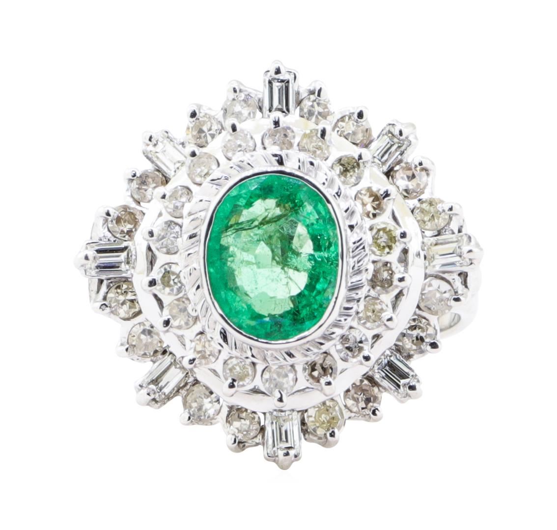 One electronically tested 14KT white gold lady's hand fabricated fashion ballerina double halo ring with a bright polish finish. The featured lady's ring has a shank measuring 3.00 millimeters in width. Condition is Good. Containing: One bezel set oval mo GAS Appraised.