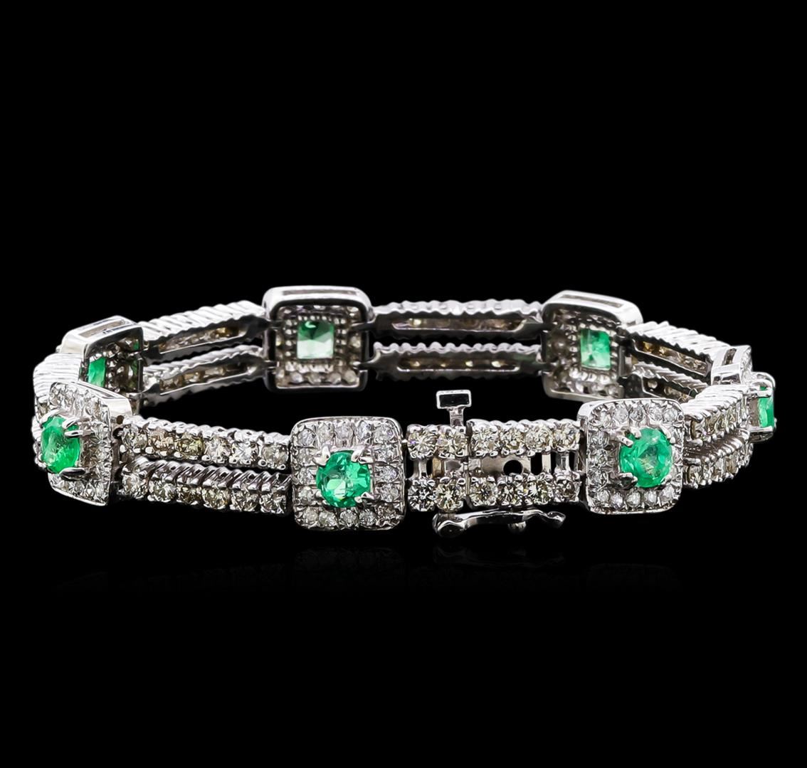 One electronically tested 14KT white gold ladies cast & assembled emerald and diamond bracelet with a bright polish finish. Seven inch length bracelet composed of emerald and diamond bezels, supported by mirroring diamond ribbons terminating in a concealed clasp with safety. Identified with markings of "14K". Condition is good. Containing: Seven prong set round mixed cut natural emeralds, measuring 4.80 - 4.80 x 3.12 mm, approximate total weight of 2.84ct., clarity is slightly included, type III, medium dark, very slightly grayish, very slightly bluish green color, (GIA vslbG 6/3), cut is good. Transmitting light with a minimum of distortion, transparent. Naturally occurring internal & external characteristics are present. Indications of oil residue. Color grade is an average for the group. Graded in the setting. One Hundred Ninety-Six prong & bead set round brilliant cut diamonds, measuring 2.50 - 1.60 x 1.23mm (depth est.) approximate total weight of 196 Stones = 6.86ct. Graded in the setting. Clarity: SI-2 to I-2. Color: I - K. Total Weight of Colored Stones 2.84ct. Total Weight of Diamonds 6.86ct. AIG Appraised at $21,370.00.