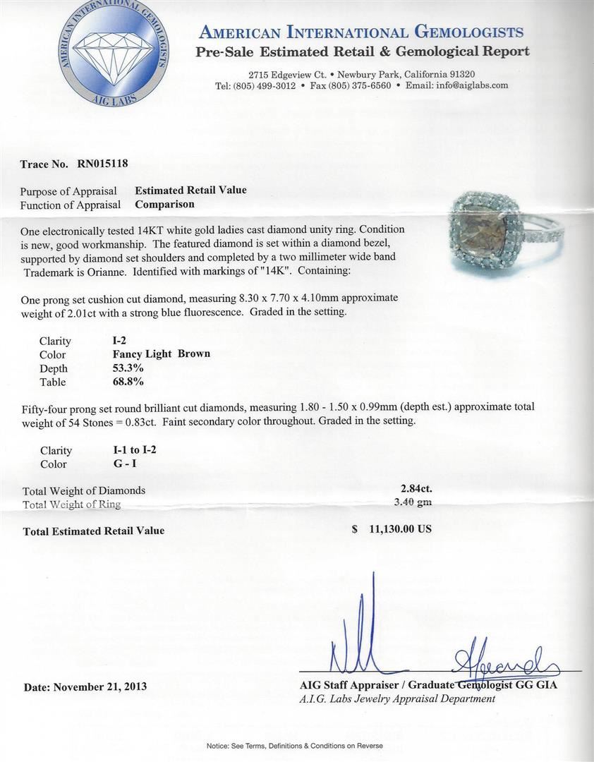 One electronically tested 14KT white gold ladies cast diamond unity ring. Condition is new, good workmanship. The featured diamond is set within a diamond bezel, supported by diamond set shoulders and completed by a two millimeter wide band Trademark is Orianne. Identified with markings of" 14K". Containing: One prong set cushion cut diamond, measuring 8.30 x 7.70 x 4.10mm approximate weight of 2.0let with a strong blue fluorescence. Graded in the setting. Clarity: I-2.Color: Fancy Light Brown. Depth. 53.3%.Table: 68.8%.Fifty-four prong set round brilliant cut diamonds, measuring 1.80 - 1.50 x 0.99mm (depth est.) approximate total weight of 54 Stones = 0.83ct. Faint secondary color throughout. Graded in the setting. Clarity: I-1 to I-2.Color: G - I. AIG Appraised at $11,130.00.