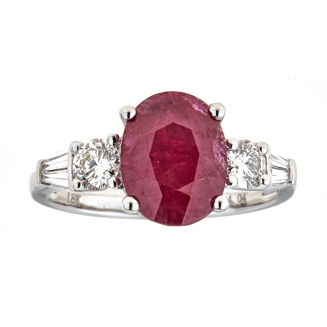 One Ruby and Diamond Ring featuring: 18KT White Gold with a total weight of 2.43 grams, Ruby with a total weight of 2.84ctw, Two Baguette Cut Diamond with a total weight of 0.14ct, and Two Round Cut Diamonds with a total weight of 0.11ctw.