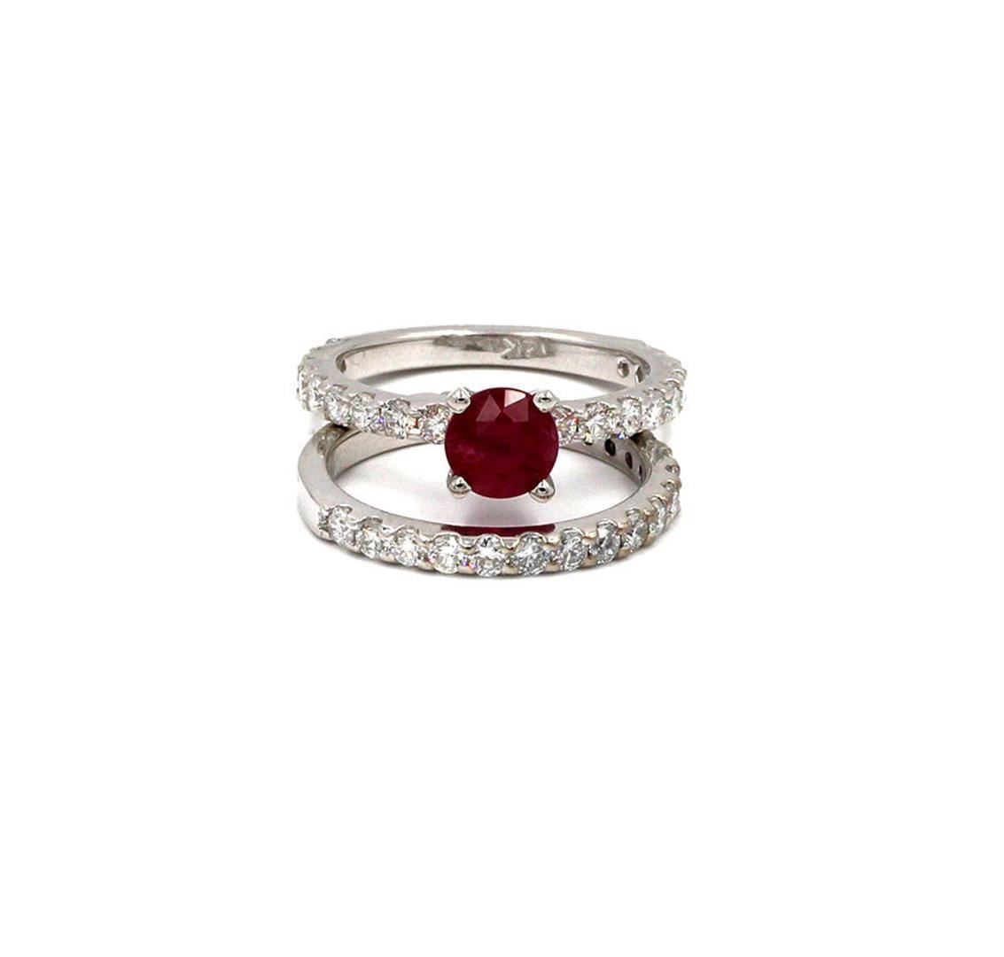One lady's engagement/wedding set featuring: 14KT white gold weighing 5.30 grams containing one ruby weighing 1.35ct and 38 diamonds weighing 1.49ctw. The ruby is round brilliant cut with a fine, deep red color and very good cut. The diamonds are round br