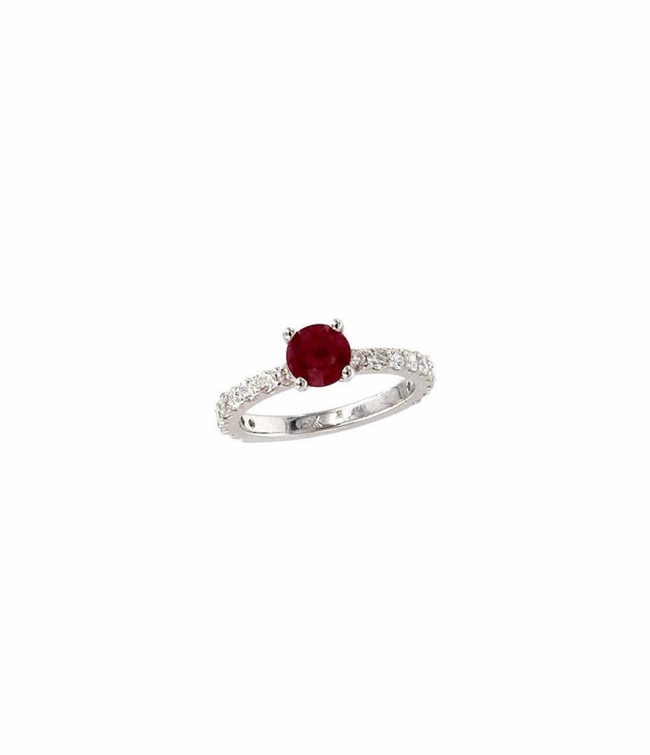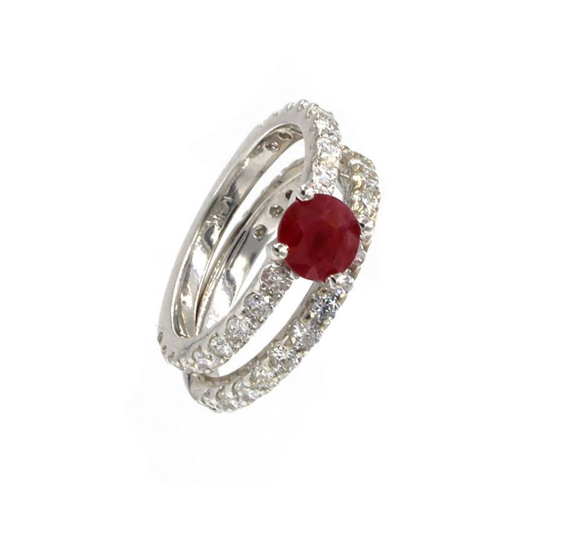 One lady's engagement/wedding set featuring: 14KT white gold weighing 5.30 grams containing one ruby weighing 1.35ct and 38 diamonds weighing 1.49ctw. The ruby is round brilliant cut with a fine, deep red color and very good cut. The diamonds are round br