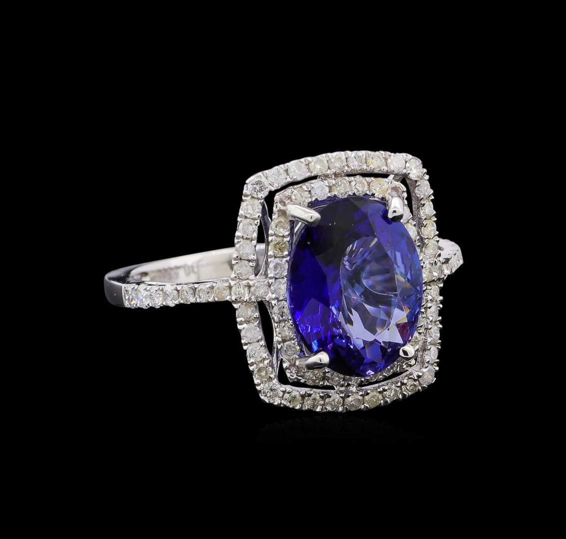 Fourteen karat (14K) white gold tanzanite and diamond ring. An oval cut tanzanite zoisite gemstone is prong mounted in the center of the ring. Round brilliant cut diamonds accent the ring around and on both sides of the center gemstone. The ring is cast stamped "14K" and has a gross weight of 2.8 grams. Diamond(s): Shape: Round brilliant cut. Weight: 0.53 carat. Average clarity: I1. Average color: H-J. Symmetry: Very good. Polish: Very good. Gemstone(s): Gemstone: Tanzanite Zoisit. Nature: Natural. Shape: Oval, faceted. Quantity: 1, mounted. Weight: 2.84 carat. Dimensions: Length-10.80 mm. ; Width- 8.75 mm. Bulge: Visible. Clarity: VS, type 1. color: Purplish blue (4/5). Symmetry: Very good. Color intensity: Medium. Transparency: Translucent. Tone: Dark. Enhancements: Coated. Metal(s): Metal: Gold, stamped. Purity: 14K. Color: White. Condition: Excellent. Finish: High polish. GGA Appraised at $5,835.00.
