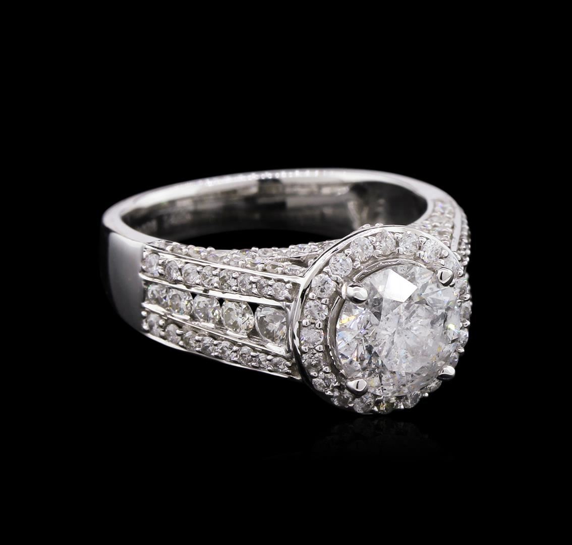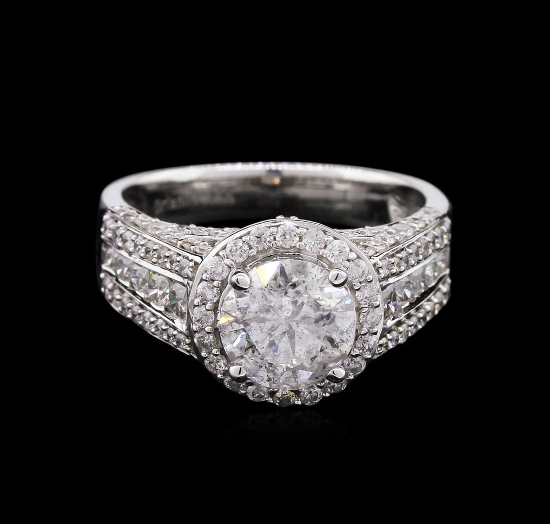 One electronically tested 14KT white gold ladies cast diamond unity ring with a bright polish finish. The featured diamond is set within a diamond bezel supported by a diamond set under gallery and diamond set shoulders, completed by a three millimeter wide band. Trademark is Orianne. Identified with markings of "14K". Condition is new, good workmanship. Containing: One prong set round brilliant cut diamond, measuring 7.35 - 7.30 x 4.60mm (depth est.) approximate weight of 1.66ct with a strong blue fluorescence. Graded in the setting. Clarity: I-2. Color: F. Depth 62.8%. Table 57.4%. One Hundred Thirty prong and channel set round brilliant cut diamonds approximate total weight of 130 Stones = 1.18ct. Graded in the setting. Clarity: I-1 to I-2. Color: G - I. Total Weight of Diamonds 2.84ct. AIG Appraised at $14,810.00.