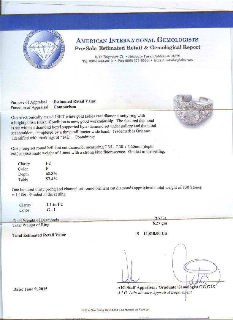 One electronically tested 14KT white gold ladies cast diamond unity ring with a bright polish finish. The featured diamond is set within a diamond bezel supported by a diamond set under gallery and diamond set shoulders, completed by a three millimeter wide band. Trademark is Orianne. Identified with markings of "14K". Condition is new, good workmanship. Containing: One prong set round brilliant cut diamond, measuring 7.35 - 7.30 x 4.60mm (depth est.) approximate weight of 1.66ct with a strong blue fluorescence. Graded in the setting. Clarity: I-2. Color: F. Depth 62.8%. Table 57.4%. One Hundred Thirty prong and channel set round brilliant cut diamonds approximate total weight of 130 Stones = 1.18ct. Graded in the setting. Clarity: I-1 to I-2. Color: G - I. Total Weight of Diamonds 2.84ct. AIG Appraised at $14,810.00.