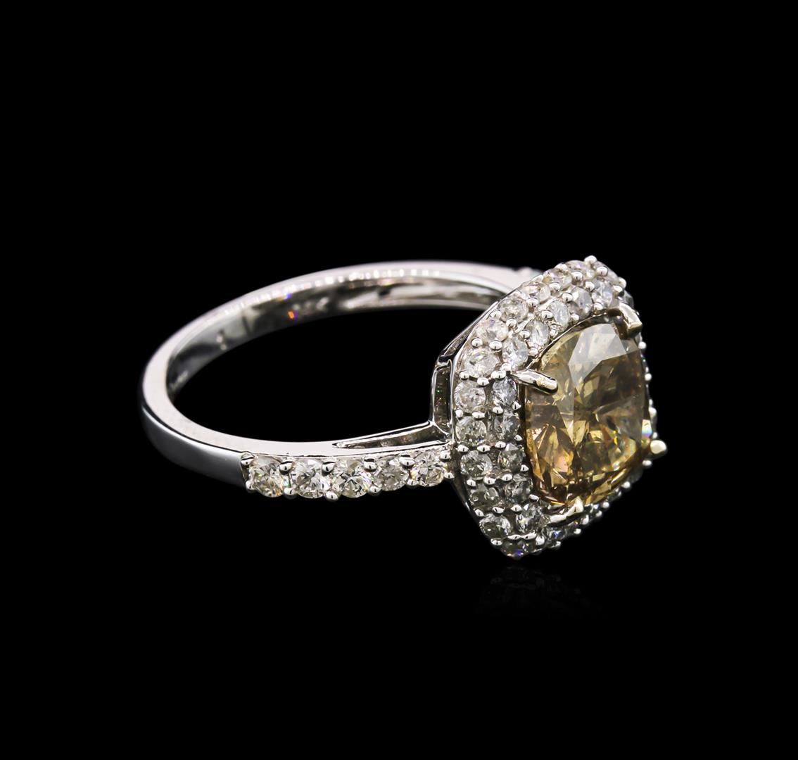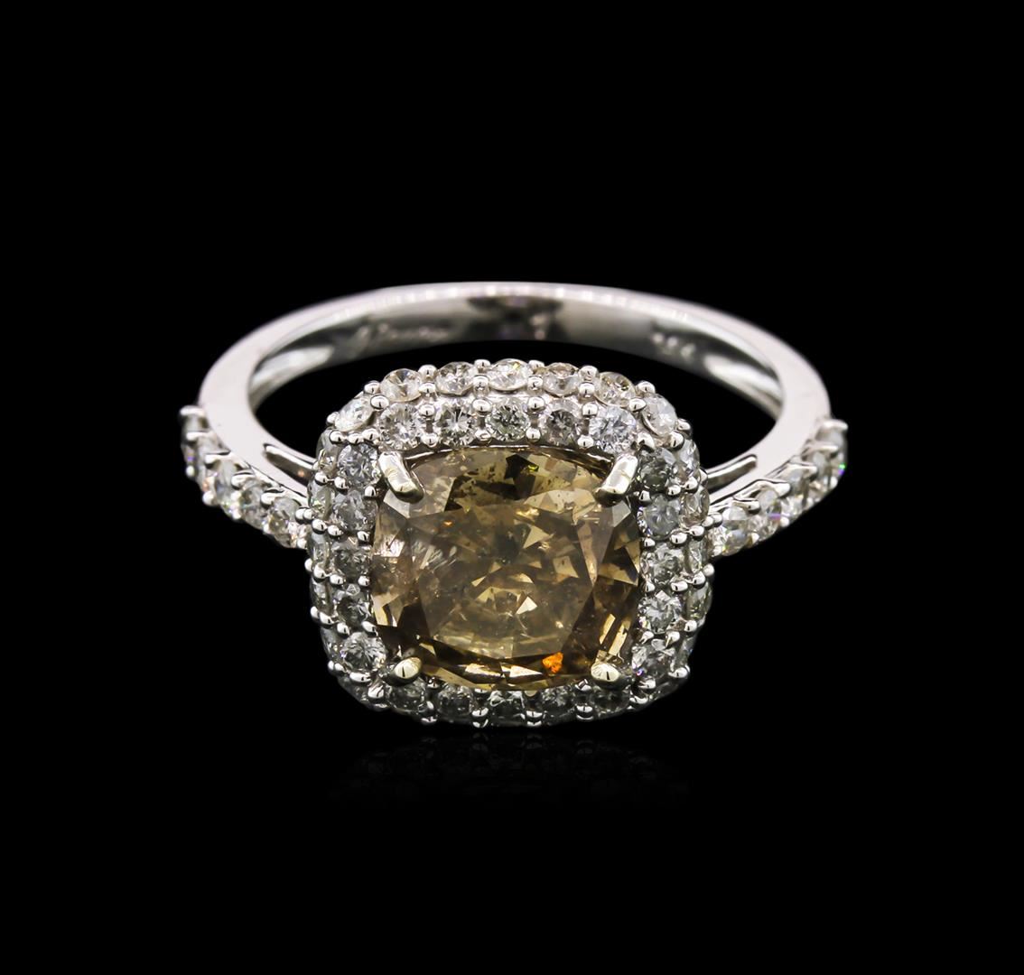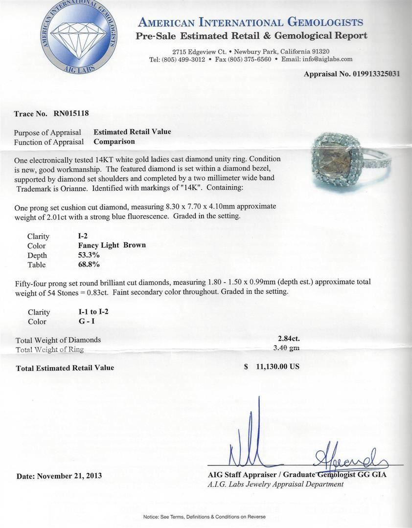 One electronically tested 14KT white gold ladies cast diamond unity ring. Condition is new, good workmanship. The featured diamond is set within a diamond bezel, supported by diamond set shoulders and completed by a two millimeter wide band Trademark is Orianne. Identified with markings of" 14K". Containing: One prong set cushion cut diamond, measuring 8.30 x 7.70 x 4.10mm approximate weight of 2.0let with a strong blue fluorescence. Graded in the setting. Clarity: I-2.Color: Fancy Light Brown. Depth. 53.3%.Table: 68.8%.Fifty-four prong set round brilliant cut diamonds, measuring 1.80 - 1.50 x 0.99mm (depth est.) approximate total weight of 54 Stones = 0.83ct. Faint secondary color throughout. Graded in the setting. Clarity: I-1 to I-2.Color: G - I. AIG Appraised at $11,130.00.