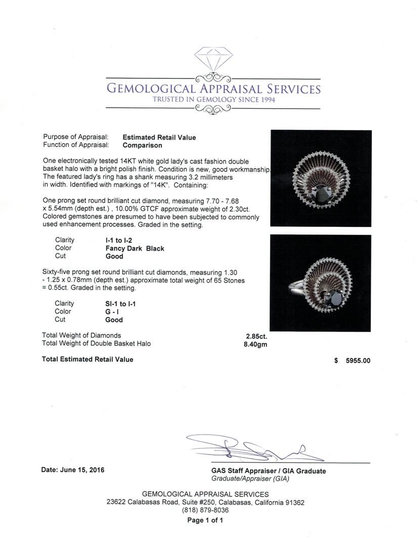 One electronically tested 14KT white gold lady's cast fashion double basket halo with a bright polish finish. The featured lady's ring has a shank measuring 3.2 millimeters in width. Identified with markings of "14K". Condition is new, good workmanship. Containing: One prong set round brilliant cut diamond, measuring 7.70 - 7.68 x 5.54mm (depth est.) , 10.00.%. GTCF approximate weight of 2.30ct. Colored gemstones are presumed to have been subjected to commonly used enhancement processes. Graded in the setting. Clarity: I-1 to I-2 Cut Good Sixty-Five prong set round brilliant cut diamonds, measuring 1.30 - 1.25 x 0.78mm (depth est.) approximate total weight of 65 Stones = 0.55ct. Graded in the setting. Clarity: SI-1 to I-1. Color: G - I. Cut Good. Total Weight of Diamonds 2.85ct. Total Weight of Double Basket Halo 8.40gm. GAS Appraised at $5,955.00.