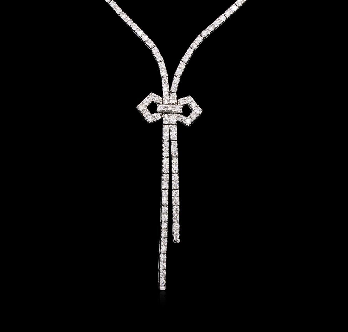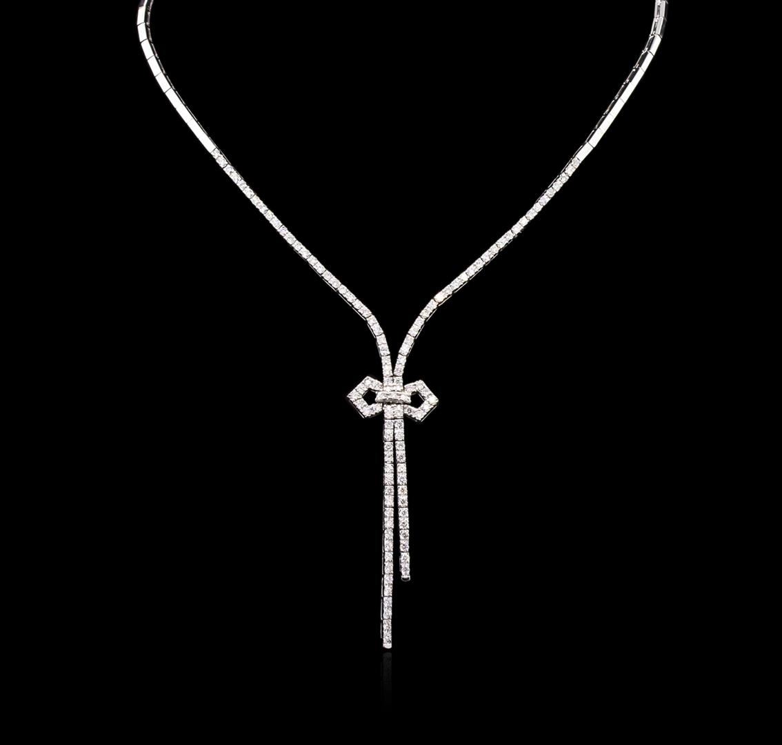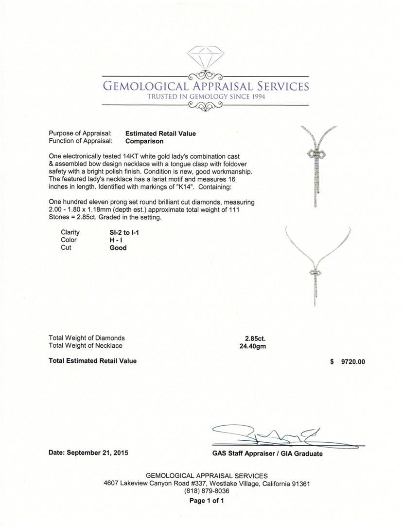 One electronically tested 14KT white gold lady's combination cast & assembled bow design necklace with a tongue clasp with foldover safety with a bright polish finish. The featured lady's necklace has a lariat motif and measures 16 inches in length. Identified with markings of "K14". Condition is new, good workmanship. Containing: One Hundred Eleven prong set round brilliant cut diamonds, measuring 2.00 - 1.80 x 1.18mm (depth est.) approximate total weight of 111 Stones = 2.85ct. Graded in the setting. Clarity: SI-2 to I-1. Color: H - I. Cut Good. Total Weight of Diamonds 2.85ct. Total Weight of Necklace 24.40gm at $9720.00.. GAS Appraised at $9,720.00.