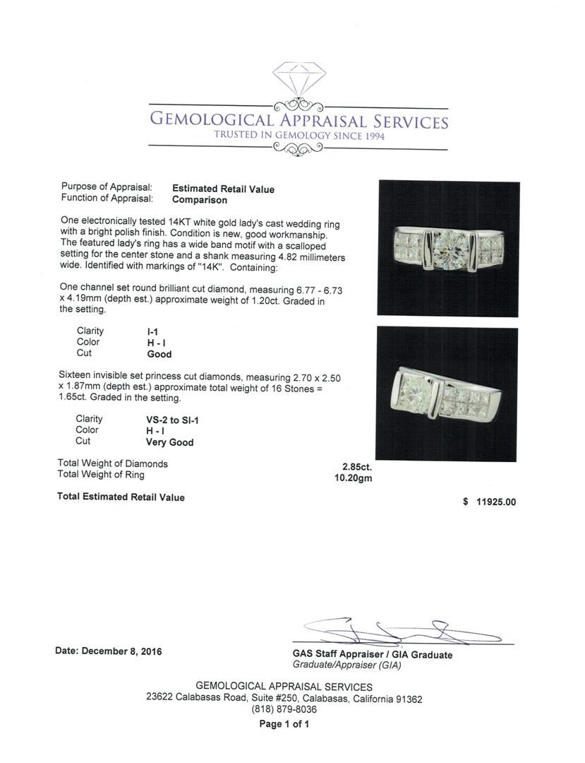 One electronically tested 14KT white gold lady's cast wedding ring with a bright polish finish. The featured lady's ring has a wide band motif with a scalloped setting for the center stone and a shank measuring 4.82 millimeters wide. Identified with markings of '14K'. Condition is new, good workmanship. Containing: One channel set round brilliant cut diamond, measuring 6.77 - 6.73 x 4.19mm (depth est.) approximate weight of 1.20ct. Graded in the setting. Clarity I-1. Color: H - I Cut Good Sixteen invisible set princess cut diamonds, measuring 2.70 x 2.50 x 1.87mm (depth est.) approximate total weight of 16 Stones = 1.65ct. Graded in the setting. Clarity VS-2 to SI-1. Color: H - I Cut Very Good. Total Weight of Diamonds 2.85ct.. Total Weight of Ring 10.20gm. GAS Appraised at $11,925.00.