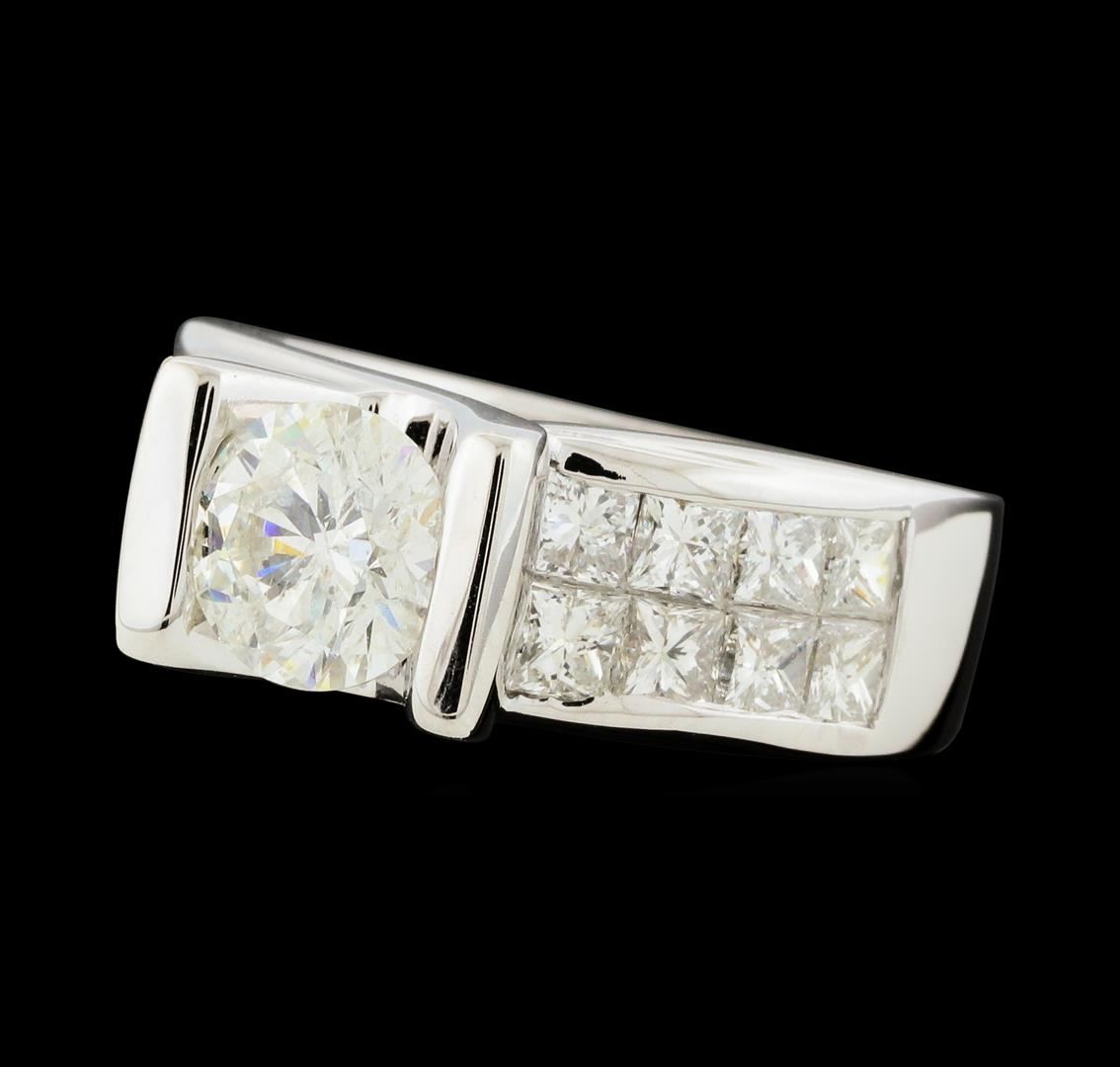 One electronically tested 14KT white gold lady's cast wedding ring with a bright polish finish. The featured lady's ring has a wide band motif with a scalloped setting for the center stone and a shank measuring 4.82 millimeters wide. Identified with markings of '14K'. Condition is new, good workmanship. Containing: One channel set round brilliant cut diamond, measuring 6.77 - 6.73 x 4.19mm (depth est.) approximate weight of 1.20ct. Graded in the setting. Clarity I-1. Color: H - I Cut Good Sixteen invisible set princess cut diamonds, measuring 2.70 x 2.50 x 1.87mm (depth est.) approximate total weight of 16 Stones = 1.65ct. Graded in the setting. Clarity VS-2 to SI-1. Color: H - I Cut Very Good. Total Weight of Diamonds 2.85ct.. Total Weight of Ring 10.20gm. GAS Appraised at $11,925.00.