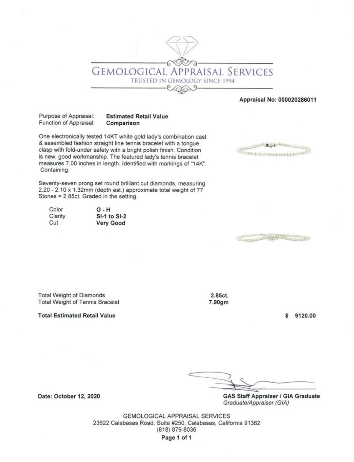 One electronically tested 14KT white gold lady's combination cast & assembled fashion straight line tennis bracelet with a tongue clasp with fold-under safety with a bright polish finish. The featured lady's tennis bracelet measures 7.00 inches in length. Identified with markings of '14K'. Condition is new, good workmanship. Containing: Seventy-Seven prong set round brilliant cut diamonds, measuring 2.20 - 2.10 x 1.32mm (depth est.) approximate total weight of 77 Stones = 2.85ct. Graded in the setting. Color G - H Clarity SI-1 to SI-2 Cut Very Good. Total Weight of Diamonds 2.85ct.. Total Weight of Tennis Bracelet 7.90gm GAS Appraised at $9120.00. GAS Appraised.
