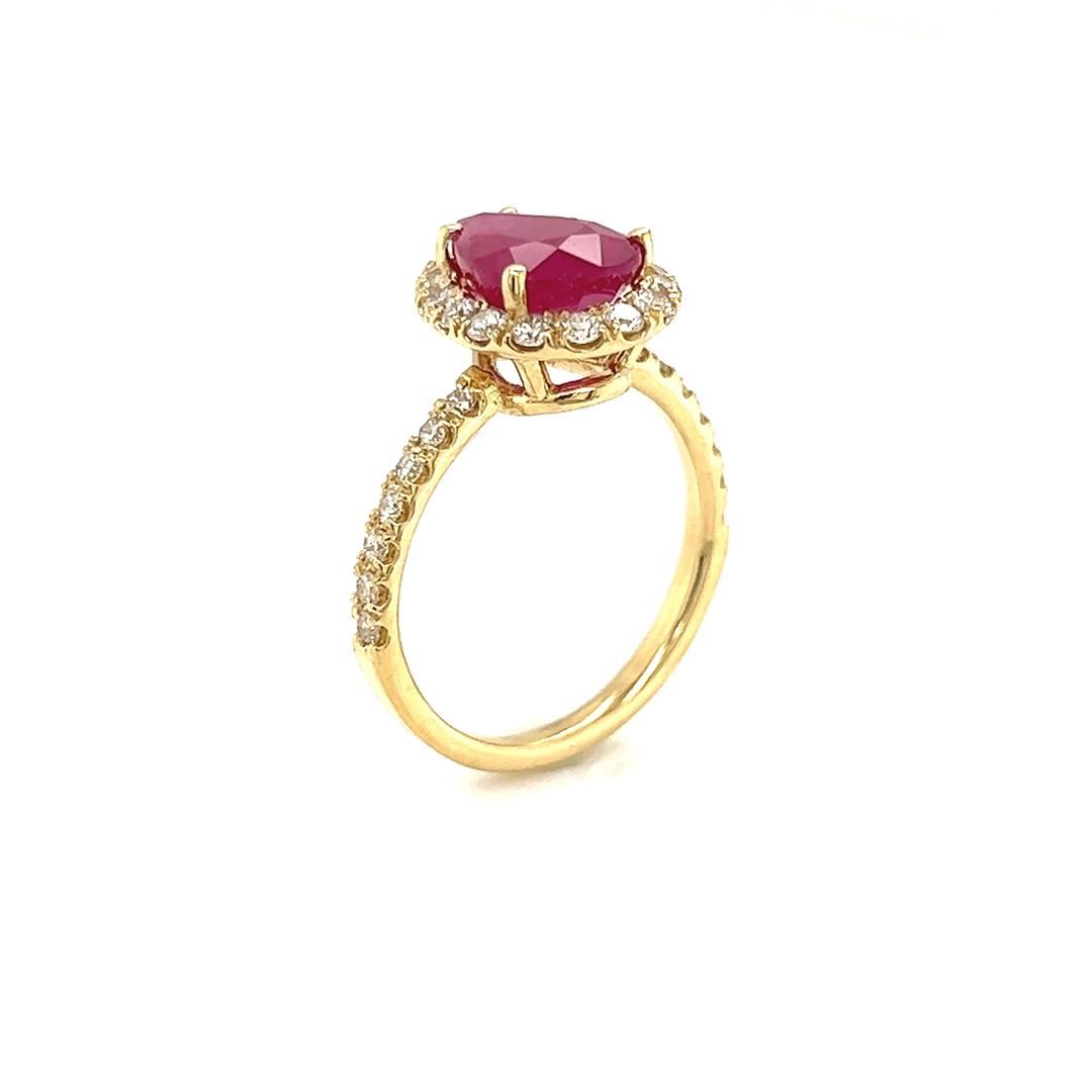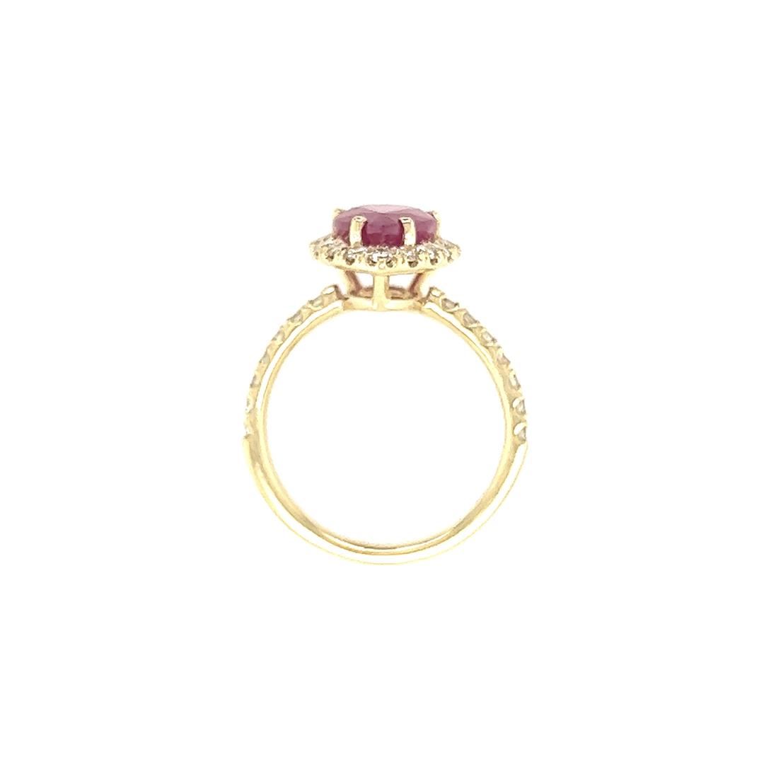 One electronically tested 14KT yellow gold lady's cast fashion ring with a basket halo with a bright polish finish. Condition is new, good workmanship. The featured lady's ring has a shank measuring 2.00 millimeters in width. Identified with markings of "14K'. Containing: One prong set pear modified mixed cut natural ruby, measuring 10.45 x 7.50 x 3.65mm, (depth est.) 20% bulge factor, approximate weight of 2.85ct., clarity is severely included, medium, moderately strong, slightly purplish red color, (GIA slpR 5/4), cut is very good. Transmitting light somewhat diffusely, semi-transparent to translucent. Naturally occurring internal & external characteristics are present. Indications of laboratory high temperature heat treatment. Colored gemstones are presumed to have been subjected to commonly used enhancement processes. Graded in the setting. Thirty prong set round brilliant cut diamonds, measuring 1.80 -1.70 x 1.09mm (depth est.) approximate total weight of 30 Stones = 0.63ct. Graded in the setting. Color G - H Clarity VS-2 to SI-1 Cut Very Good Total Weight of Colored Stones Total Weight of Diamonds Total Weight of Ring 2.85ct. 0.63ct. 3.60gm Appraisal No: 000022197007 Total Estimated Retail Value $ 6500.00