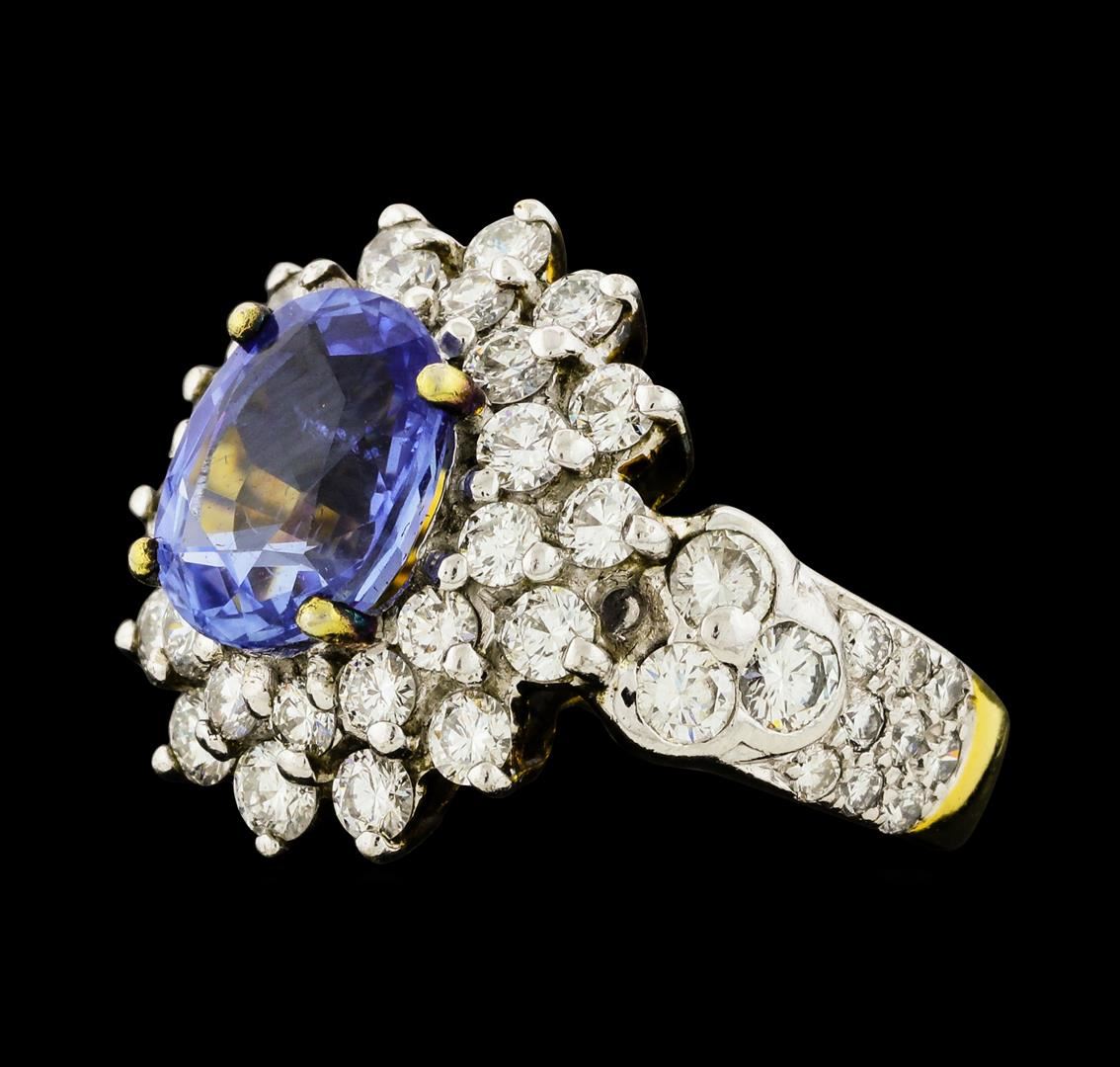 One electronically tested 9KT yellow with rhodium plating gold lady's combination cast & assembled fashion ring with a double basket halo with a bright polish finish. The featured lady's ring has a shank measuring 3.50 millimeters wide. Condition is used, good workmanship. Containing: One prong set oval modified mixed cut natural blue sapphire, measuring 9.48 x 7.61 x 4.71mm, (depth est.) approximate weight of 2.85ct., clarity is slightly included, medium light, very slightly grayish, blue color, (GIA B 4/3), cut is good. Transmitting light with a minimum of distortion, transparent. Colored gemstones are presumed to have been subjected to commonly used enhancement processes. Graded in the setting. Six bezel set round brilliant cut diamonds, measuring 2.80 - 2.70 x 1.71mm (depth est.) approximate total weight of 6 Stones = 0.48ct. Graded in the setting. Clarity VS-2 to SI-1. Color: H - I Cut Good Twenty-Eight prong set round brilliant cut diamonds, measuring 2.40 - 2.20 x 1.43mm (depth est.) approximate total weight of 28 Stones = 1.30ct. Graded in the setting. Clarity VS-2 to SI-1. Color: H - I Cut Very Good Eighteen prong set round brilliant cut diamonds, measuring 1.70 - 1.60 x 1.02mm (depth est.) approximate total weight of 18 Stones = 0.30ct. Graded in the setting. Clarity VS-2 to SI-1. Color: H - I Cut Good. Total Weight of Colored Stones 2.85ct.. Total Weight of Diamonds 2.08ct.. Total Weight of Ring 7.40gm. GAS Appraised at $8,735.00.