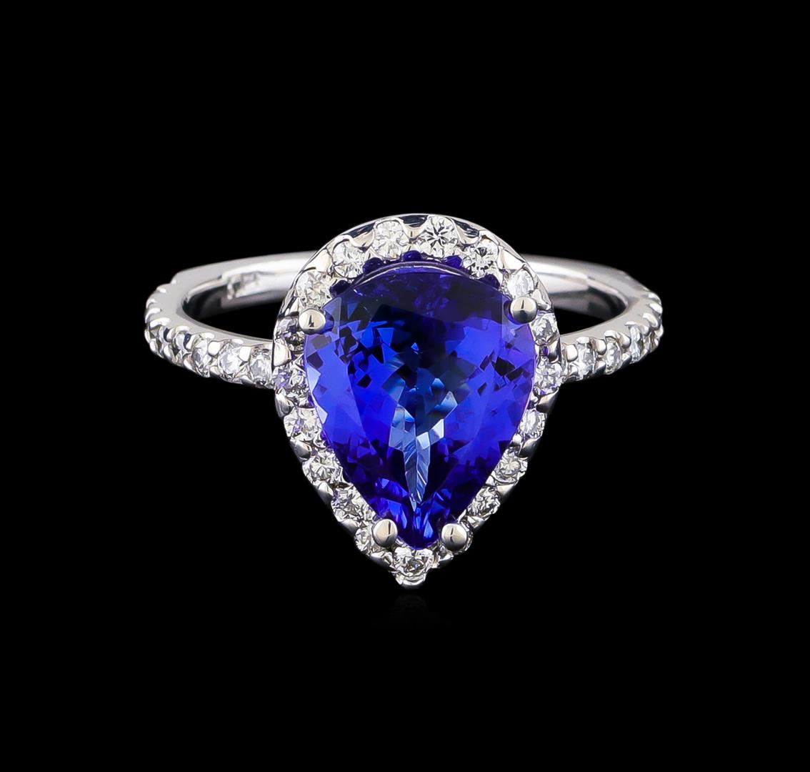 One electronically tested 14KT white gold lady's cast fashion ring with a basket halo with a bright polish finish. The featured lady's ring has a shank measuring 1.70 millimeters in width. Identified with markings of "K14". Condition is new, good workmanship. Containing: One prong set pear modified brilliant cut natural tanzanite, measuring 10.92 x 8.87 x 4.69mm, (depth est.) approximate weight of 2.85ct., clarity is eye clean, medium dark, moderately strong, bluish violet color, (GIA bV 6/4), cut is very good. Transmitting light with no distortion, transparent. Colored gemstones are presumed to have been subjected to commonly used enhancement processes. Graded in the setting. Thirty-Nine prong set round brilliant cut diamonds, measuring 1.60 - 1.50 x 0.96mm (depth est.) approximate total weight of 39 Stones = 0.55ct. Graded in the setting. Clarity: VS-2 to SI-2. Color: G - I. Cut Good. Total Weight of Colored Stones 2.85ct. Total Weight of Diamonds 0.55ct. Total Weight of Ring 3.50gm GAS Appraised at $6,355.00.