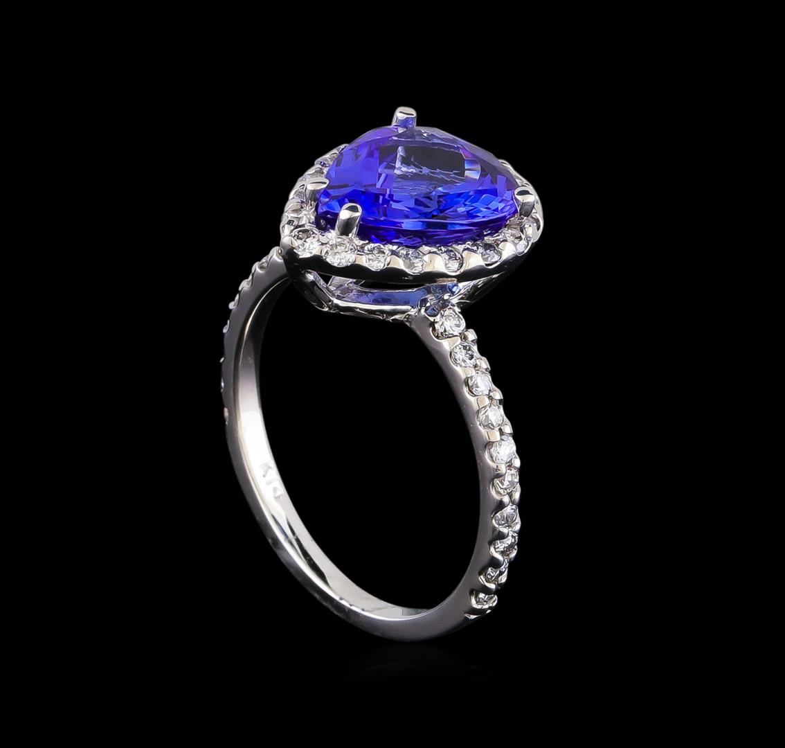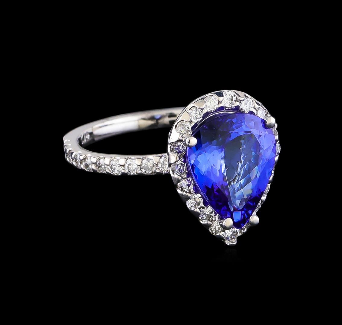 One electronically tested 14KT white gold lady's cast fashion ring with a basket halo with a bright polish finish. The featured lady's ring has a shank measuring 1.70 millimeters in width. Identified with markings of "K14". Condition is new, good workmanship. Containing: One prong set pear modified brilliant cut natural tanzanite, measuring 10.92 x 8.87 x 4.69mm, (depth est.) approximate weight of 2.85ct., clarity is eye clean, medium dark, moderately strong, bluish violet color, (GIA bV 6/4), cut is very good. Transmitting light with no distortion, transparent. Colored gemstones are presumed to have been subjected to commonly used enhancement processes. Graded in the setting. Thirty-Nine prong set round brilliant cut diamonds, measuring 1.60 - 1.50 x 0.96mm (depth est.) approximate total weight of 39 Stones = 0.55ct. Graded in the setting. Clarity: VS-2 to SI-2. Color: G - I. Cut Good. Total Weight of Colored Stones 2.85ct. Total Weight of Diamonds 0.55ct. Total Weight of Ring 3.50gm GAS Appraised at $6,355.00.
