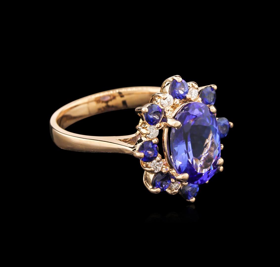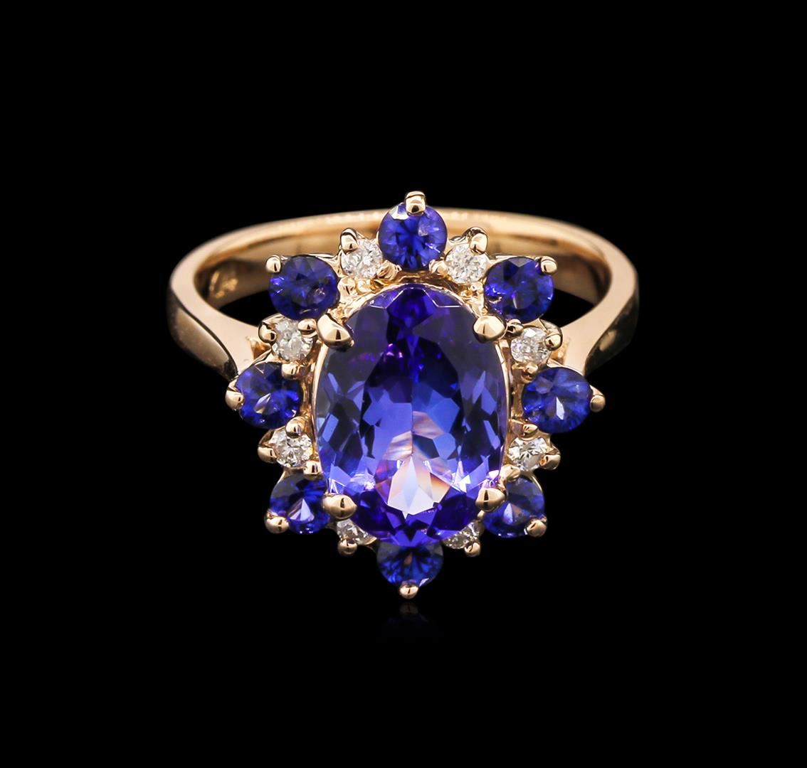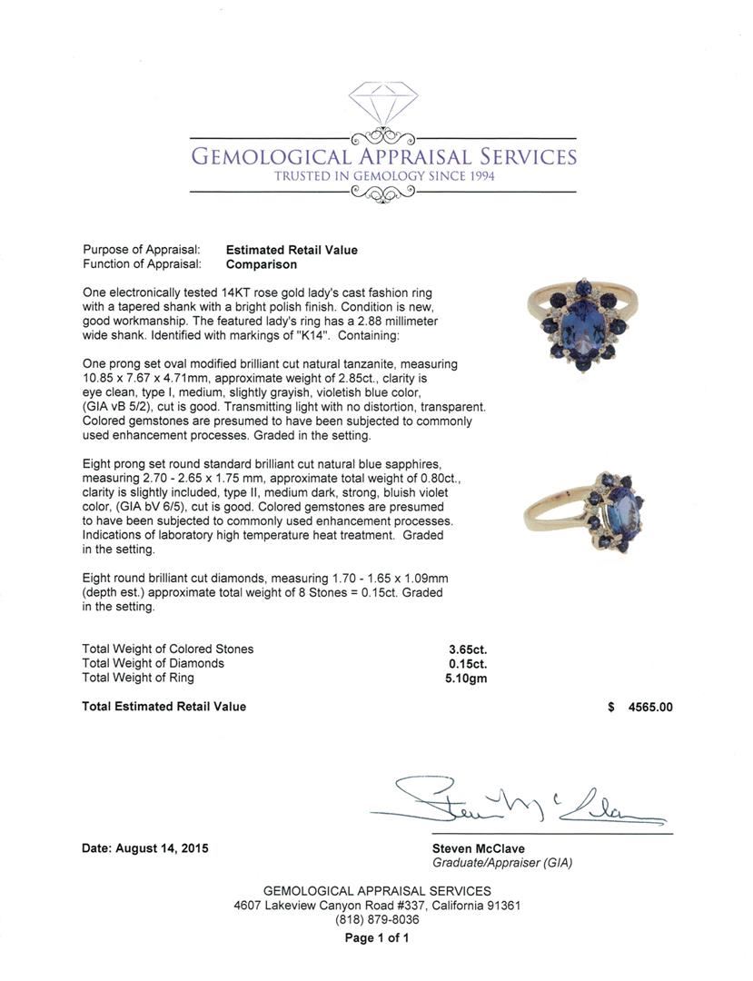 One electronically tested 14KT rose gold lady's cast fashion ring with a tapered shank with a bright polish finish. The featured lady's ring has a 2.88 millimeter wide shank. Identified with markings of "K14". Condition is new, good workmanship. Containing: One prong set oval modified brilliant cut natural tanzanite, measuring 10.85 x 7.67 x 4.71mm, approximate weight of 2.85ct., clarity is eye clean, type I, medium, slightly grayish, violetish blue color, (GIA vB 5/2), cut is good. Transmitting light with no distortion, transparent. Colored gemstones are presumed to have been subjected to commonly used enhancement processes. Graded in the setting. Eight prong set round standard brilliant cut natural blue sapphires, measuring 2.70 - 2.65 x 1.75 mm, approximate total weight of 0.80ct., clarity is slightly included, type II, medium dark, strong, bluish violet color, (GIA bV 6/5), cut is good. Colored gemstones are presumed to have been subjected to commonly used enhancement processes. Indications of laboratory high temperature heat treatment. Graded in the setting. Eight round brilliant cut diamonds, measuring 1.70 - 1.65 x 1.09mm (depth est.) approximate total weight of 8 Stones = 0.15ct. Graded in the setting. Total Weight of Colored Stones 3.65ct. Total Weight of Diamonds 0.15ct. Total Weight of Ring 5.10gm. GAS Appraised at $4,565.00.