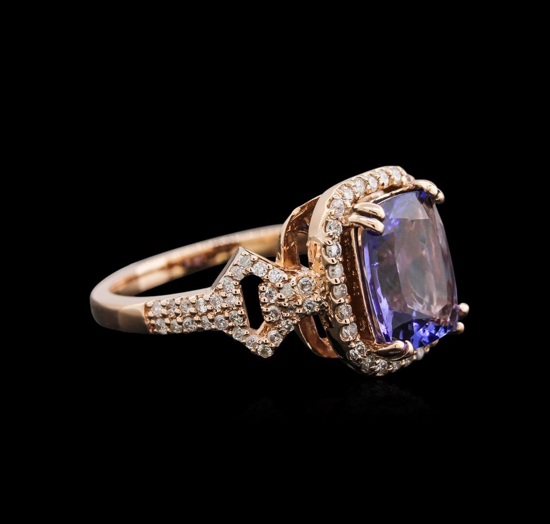 One electronically tested 14KT rose gold lady's cast fashion ring with a halo with a bright polish finish. The featured lady's ring has a shank measuring 1.95 millimeters wide. Identified with markings of "K14". Condition is new, good workmanship. Containing: One prong set rectangular cushion modified brilliant cut natural tanzanite, measuring 10.15 x 7.95 x 4.43mm, approximate weight of 2.85ct., clarity is eye clean, type I, medium, very slightly grayish, bluish violet color, (GIA bV 5/3), cut is good. Transmitting light with no distortion, transparent. Colored gemstones are presumed to have been subjected to commonly used enhancement processes. Graded in the setting. Eighty-Four prong set round brilliant cut diamonds, measuring 1.20 - 1.10 x 0.74mm (depth est.) approximate total weight of 84 Stones = 0.50ct. Graded in the setting. Clarity: SI-2 to I-1. Color: H - I. Cut Good. Total Weight of Colored Stones 2.85ct. Total Weight of Diamonds 0.50ct. Total Weight of Ring 6.10gm. GAS Appraised at $5,705.00.