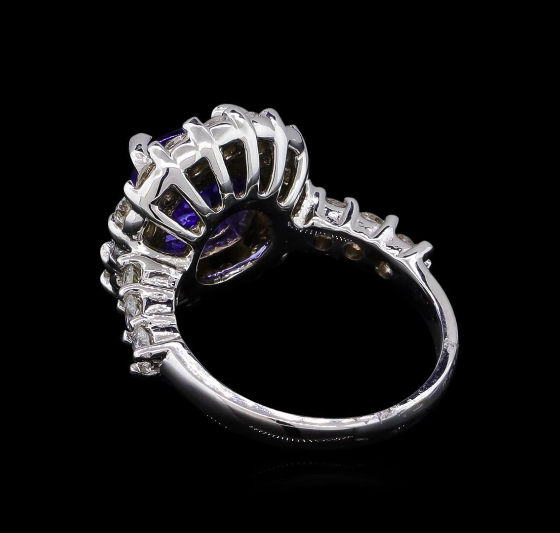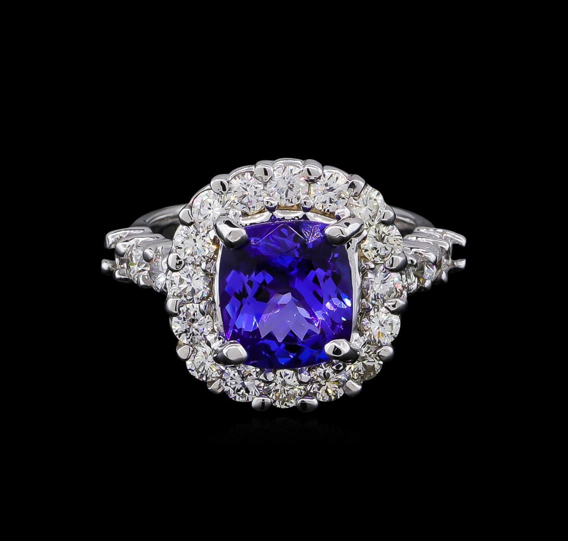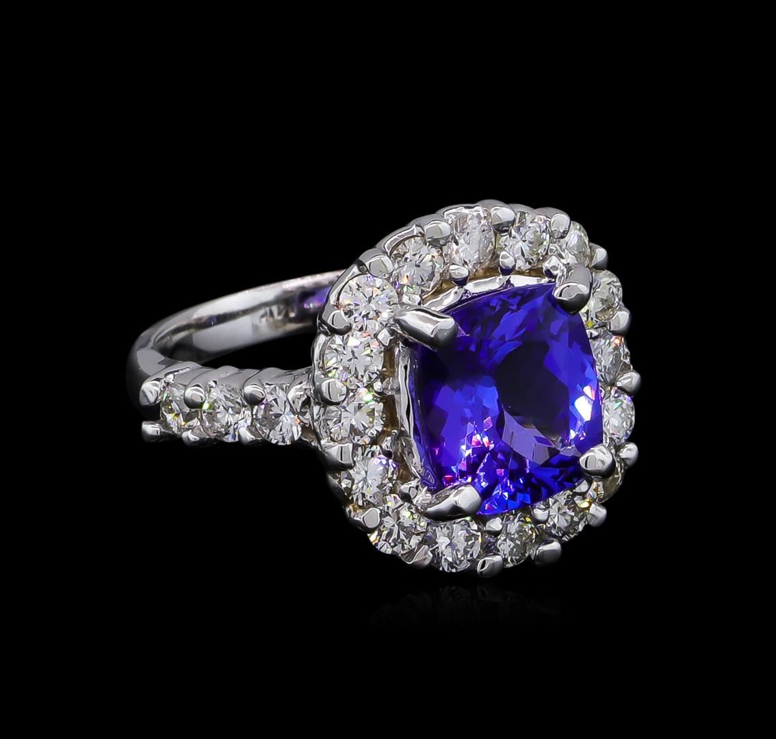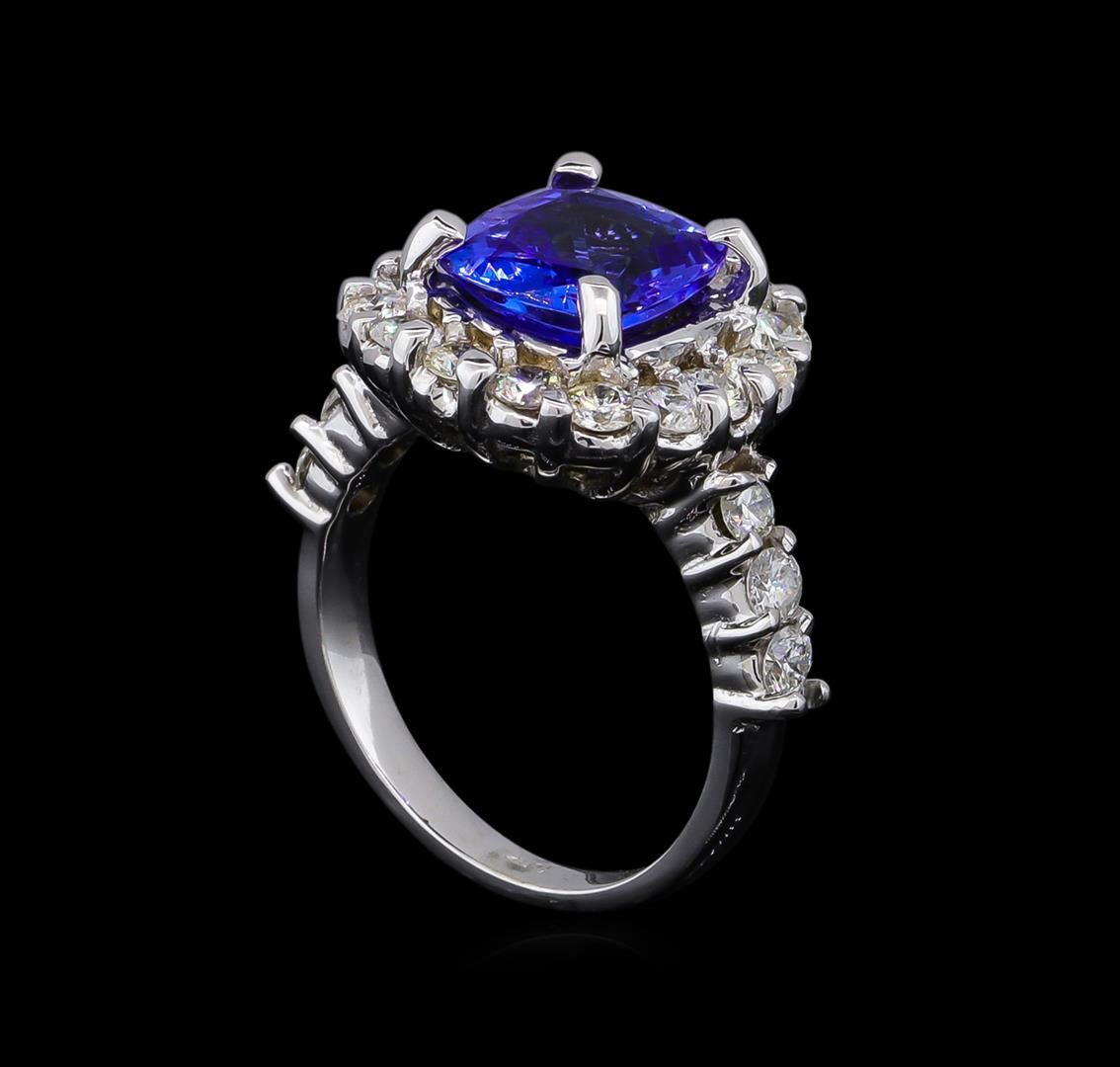 One electronically tested 14KT white gold ladies cast tanzanite and diamond ring with a bright polish finish. The featured tanzanite is set within a diamond bezel supported by a ribbed under gallery and diamond set shoulders, completed by a two millimeter wide band. Identified with markings of "14K". Condition is new, good workmanship. Containing: One prong set rectangular cushion mixed cut natural tanzanite, measuring 9.10 x 8.00 x 5.00mm, approximate weight of 2.85ct., clarity is eye clean, type I, medium dark, very slightly grayish, violetish blue color, (GIA vB 6/3), cut is good. Transmitting light with no distortion, transparent. Graded in the setting. Tanzanite is a very rare gemstone that is only found in the country of Tanzania. Originally discovered in 1967. Tiffany & Company, named the stone Tanzanite. It is found in the Usumburu Mountains that border the Umba Valley of northern Tanzania. Tanzanite occurs in gray, brown, violet, blue, reddish-purple, & green. The gem is interesting because of its exceptional pleochroism. Rotated in different directions a tanzanite will exhibit multiple changes of color. Tanzanite has a low tolerance to ultrasonic cleaning, and should not be cleaned using this method. Twenty-Two prong set round brilliant cut diamonds approximate. Total Weight of 22 Stones = 1.36ct. Graded in the setting. Clarity: SI-1 to I-1. Color: E - G. Total Weight of Colored Stones 2.85ct. Total Weight of Diamonds 1.36ct. Total Weight of Ring 7.52gm. AIG Appraised at $11,125.00.
