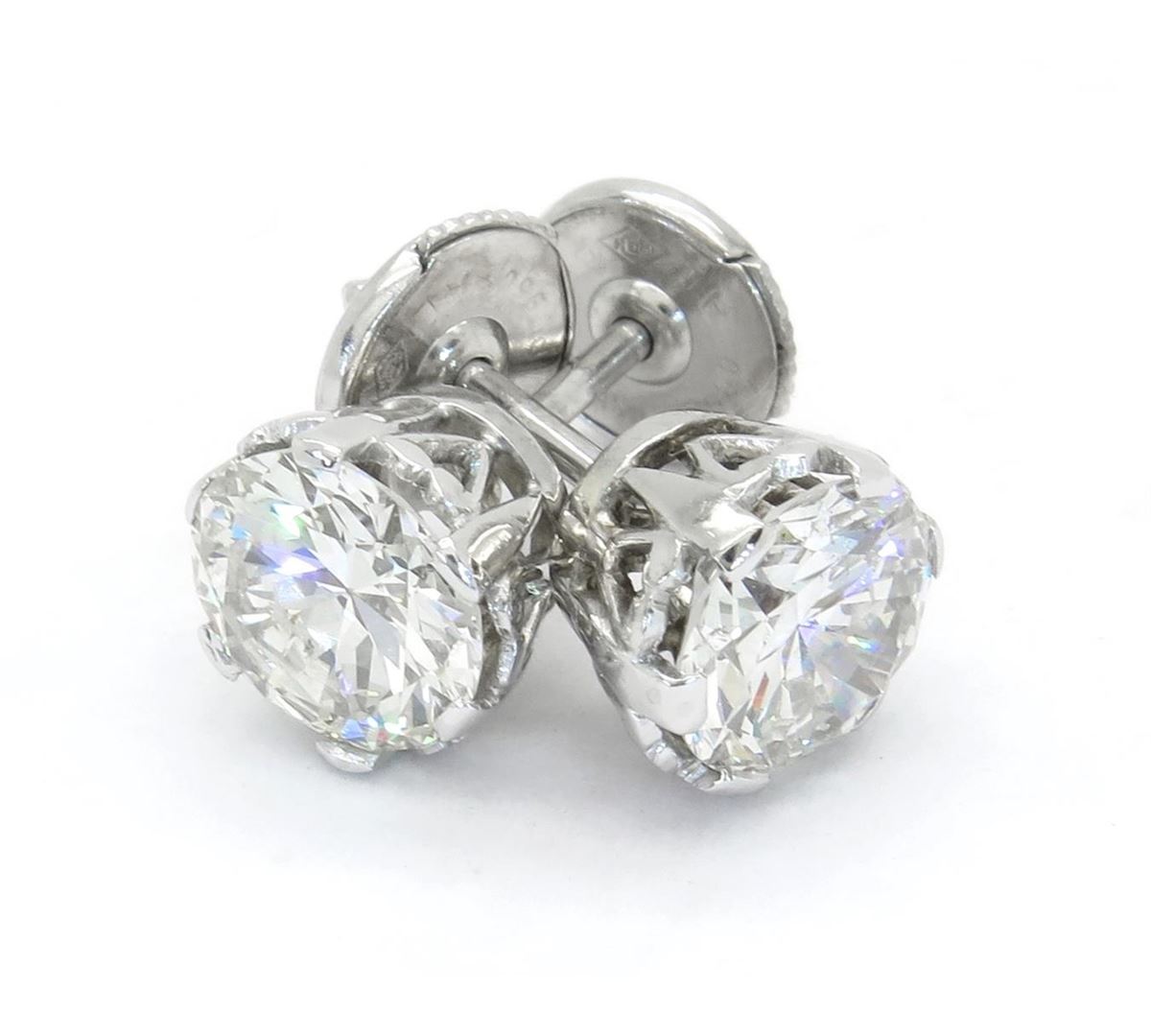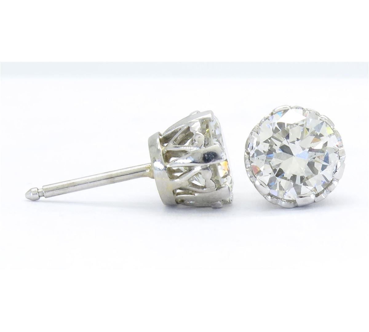 Two tested platinum diamond stud earrings. Containing: Two Round Transitional Cut Diamonds. Clarity: SI1, Color: H-I. Approximate total diamond weight: 2.85CTW. Diamonds are graded in the mounting, unless otherwise stated. Weight of earrings: 4.1 grams.
