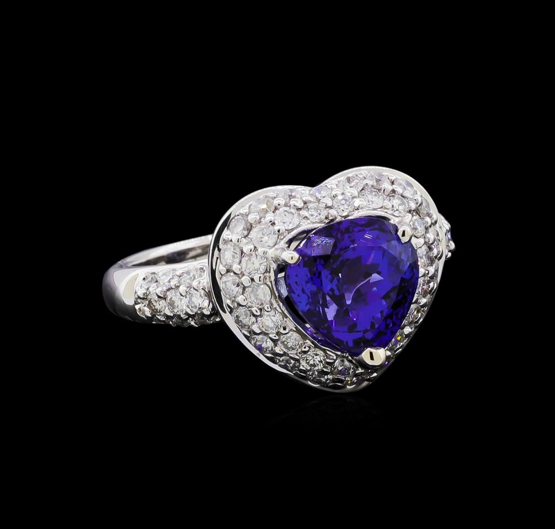 One electronically tested 18KT white gold ladies cast tanzanite and diamond ring with a bright polish finish. The featured tanzanite is set within a tiered diamond set heart shaped bezel supported by diamond set shoulders, completed by a two and one-half millimeter wide band. Trademark is Hana. Identified with markings of "18K". Condition is new, good workmanship. Containing: One prong set pear mixed cut natural tanzanite, measuring 8.00 x 8.05 x 6.25mm, 6%. bulge factor, approximate weight of 2.86ct., clarity is eye clean, type I, dark, very slightly grayish, violetish blue color, (GIA vB 7/3), cut is good. Transmitting light with no distortion, transparent. Graded in the setting. Tanzanite is a very rare gemstone that is only found in the country of Tanzania. Originally discovered in 1967. Tiffany & Company, named the stone Tanzanite. It is found in the Usumburu Mountains that border the Umba Valley of northern Tanzania. Tanzanite occurs in gray, brown, violet, blue, reddish-purple, & green. The gem is interesting because of its exceptional pleochroism. Rotated in different directions a tanzanite will exhibit multiple changes of color. Tanzanite has a low tolerance to ultrasonic cleaning, and should not be cleaned using this method. Fifty-Six prong set round brilliant cut diamonds approximate total weight of 56 Stones = 0.86ct. Graded in the setting. Clarity: I-1 to I-2. Color: G - I. Total Weight of Colored Stones 2.86ct. Total Weight of Diamonds 0.86ct. Total Weight of Ring 5.61gm. AIG Appraised at $8,890.00.