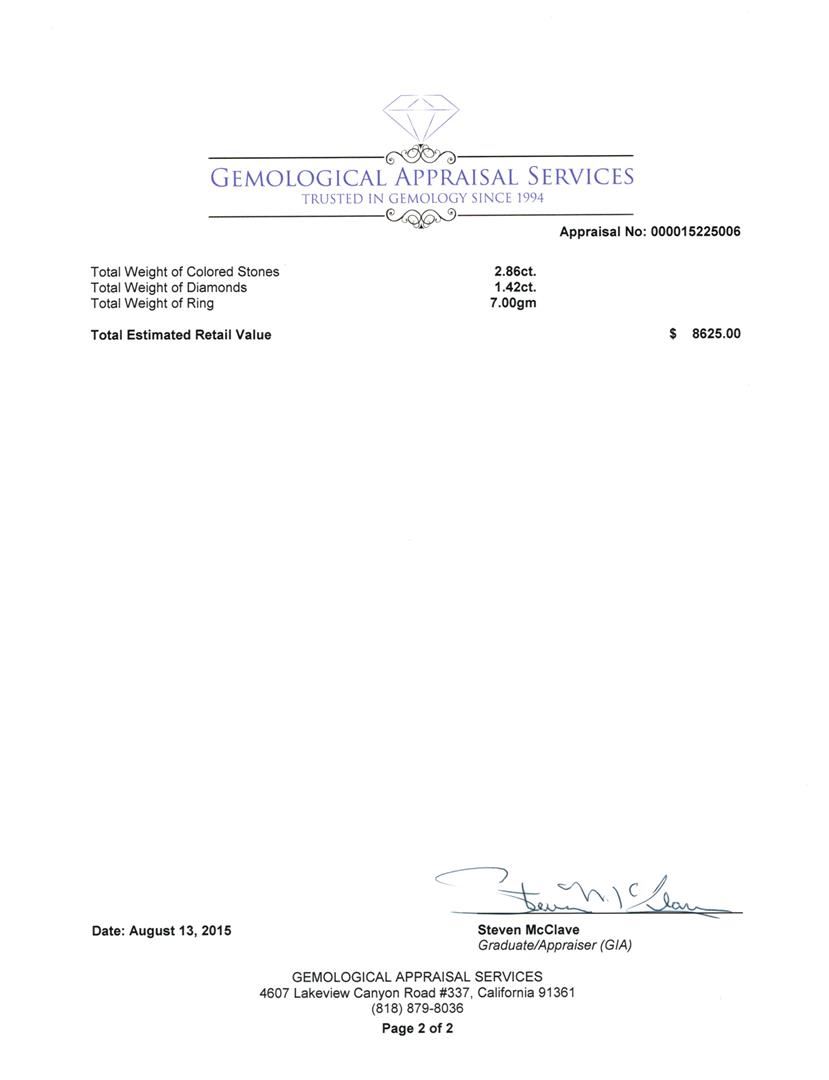 Not all Jewelry, watches or loose stones are appraised and the appraisals are provided for bidders only in certain instances at the discretion of SAA. Our appraisals are conducted by independent third-party appraisal firms. Such firms may be certified GIA Gemologists or have education in the industry or alternative certifications. Appraisals should be used for verification of gemstone and/or metal weight, size, and grade only, not actual value for resale or insurance purposes. Appraisal value should be not considered for actual value, as price varies greatly from retail locations and other merchants in different geographic locations. All Items auctioned by SAA should not be purchased with a view or expectation toward resale for appraisal price given, or to make a profit. The ultimate value for which an item can be resold may vary drastically from the appraisals listed by SAA.