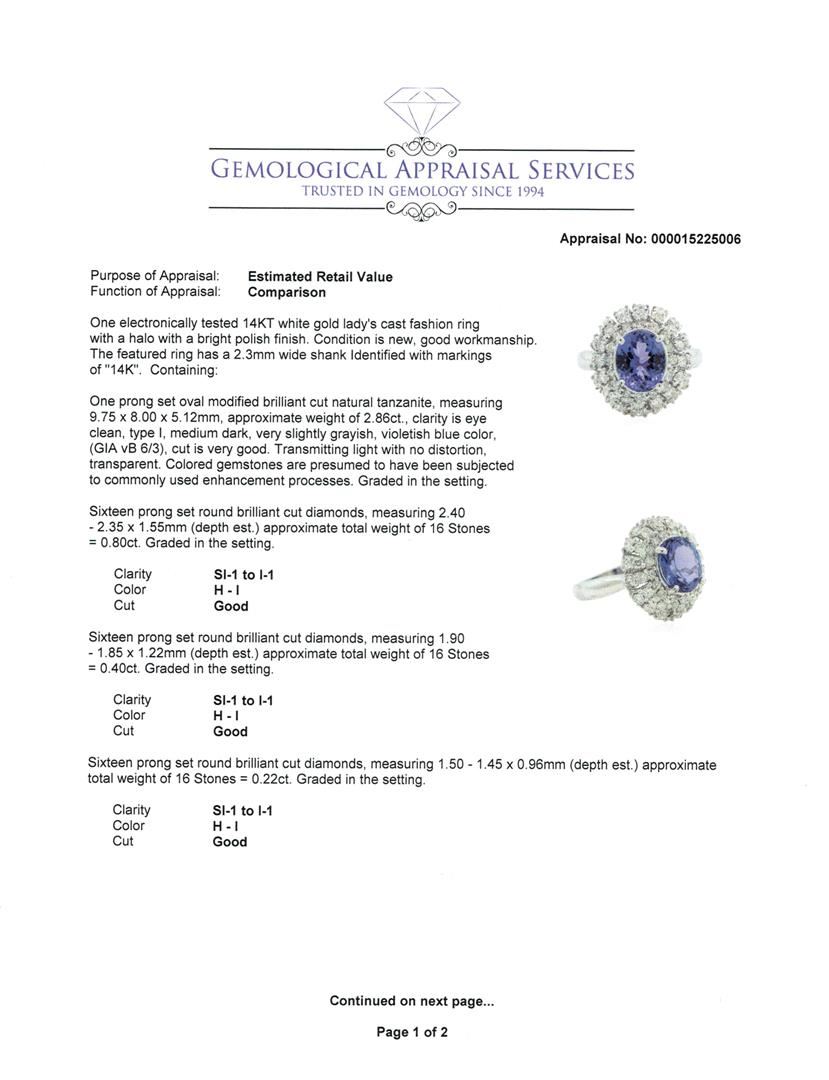 One electronically tested 14KT white gold lady's cast fashion ring with a halo with a bright polish finish. The featured ring has a 2.3mm wide shank Identified with markings of "14K". Condition is new, good workmanship. Containing: One prong set oval modified brilliant cut natural tanzanite, measuring 9.75 x 8.00 x 5.12mm, approximate weight of 2.86ct., clarity is eye clean, type I, medium dark, very slightly grayish, violetish blue color, (GIA vB 6/3), cut is very good. Transmitting light with no distortion, transparent. Colored gemstones are presumed to have been subjected to commonly used enhancement processes. Graded in the setting. Sixteen prong set round brilliant cut diamonds, measuring 2.40 - 2.35 x 1.55mm (depth est.) approximate total weight of 16 Stones = 0.80ct. Graded in the setting. Clarity: SI-1 to I-1. Color: H - I. Cut Good Sixteen prong set round brilliant cut diamonds, measuring 1.90 - 1.85 x 1.22mm (depth est.) approximate total weight of 16 Stones = 0.40ct. Graded in the setting. Clarity: SI-1 to I-1. Color: H - I. Cut Good Sixteen prong set round brilliant cut diamonds, measuring 1.50 - 1.45 x 0.96mm (depth est.) approximate total weight of 16 Stones = 0.22ct. Graded in the setting. Clarity: SI-1 to I-1. Color: H - I. Cut Good. Total Weight of Colored Stones 2.86ct. Total Weight of Diamonds 1.42ct. Total Weight of Ring 7.00gm. GAS Appraised at $8,625.00.