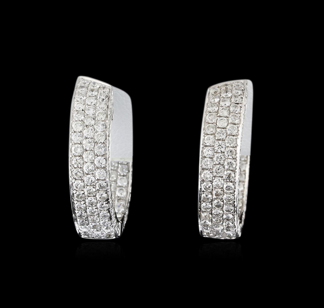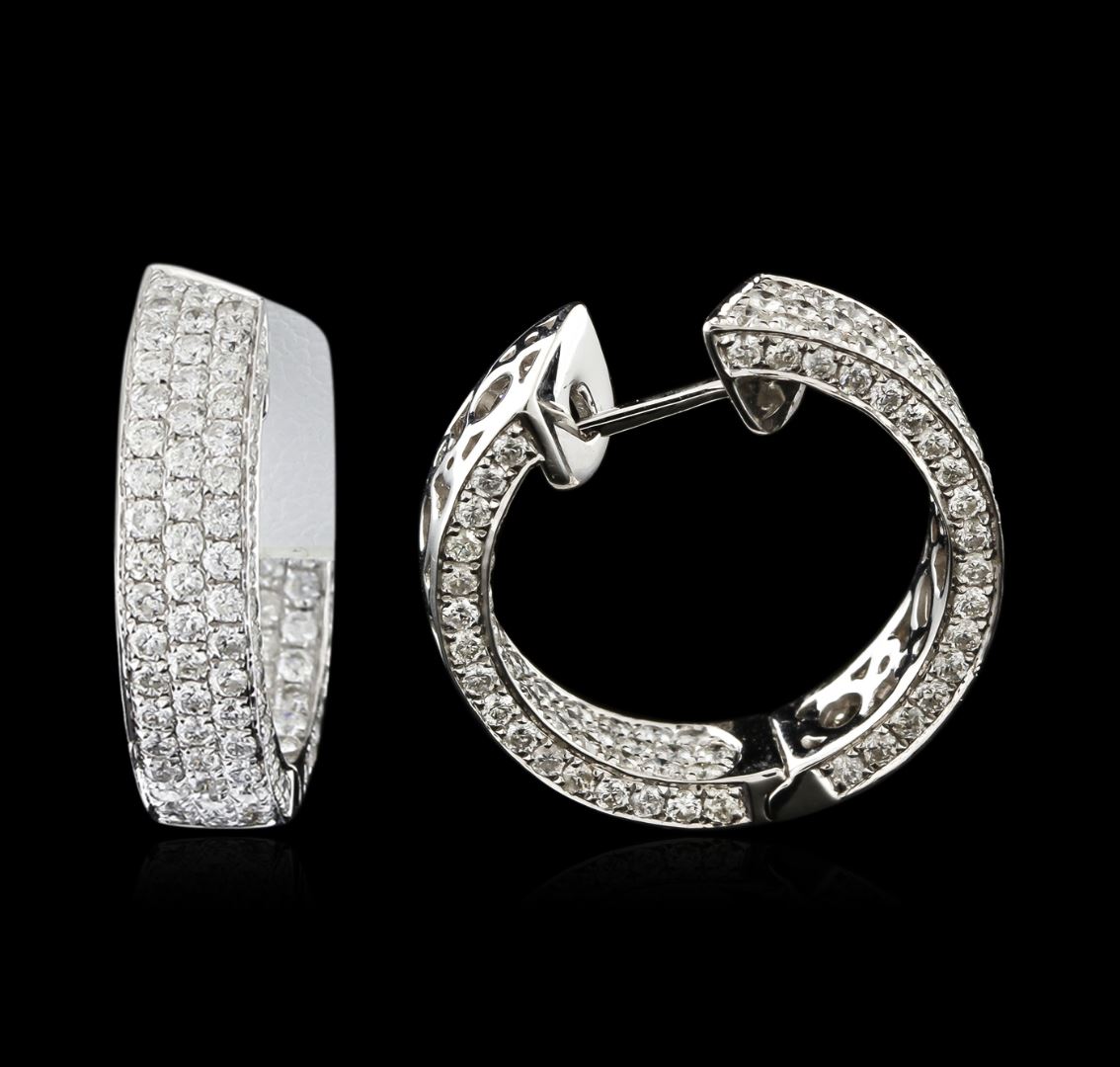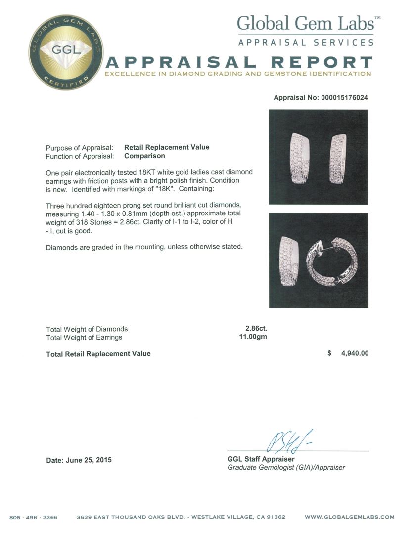 One pair electronically tested 18KT white gold ladies cast diamond earrings with friction posts with a bright polish finish. Identified with markings of "18K". Condition is new. Containing: Three Hundred Eighteen prong set round brilliant cut diamonds, measuring 1.40 - 1.30 x 0.81mm (depth est.) approximate. Total Weight of 318 Stones = 2.86ct. Clarity: I-1 to I-2. Color: H - I, Cut is Good. Diamonds are graded in the mounting, unless otherwise stated. Total Weight of Diamonds 2.86ct. Total Weight of Earrings 11.00 grams. GGL Appraised at $4,940.00.