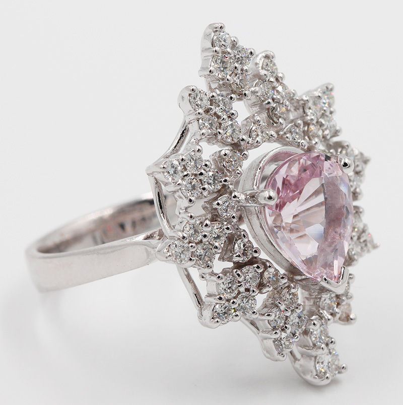 One Pear Cut Morganite Diamond Wedding Engagement Ring. Size 6.75 but resizable. This rings total carat weight is 2.87 Ct. The ring design is 3 prong with accent made in 14k white gold. Gross weight is 6.87 grams with a total of 55 stones. Condition is brand new. Condition is brand new. The main stone is non-enhanced / natural and is 1.99 Ct. Shape is pear with fine light pink clarity. Color is morganite with approximate size of 9.40 x 8.00 mm with excellent cut. Side stones are non-enhanced /natural and total 0.88 Ct. Side diamond shape is brilliant rount cut with SI1 clarity and G-H color. Cut is excellent with 5 total stones. Included with independent certification with a retail value of $8,400.