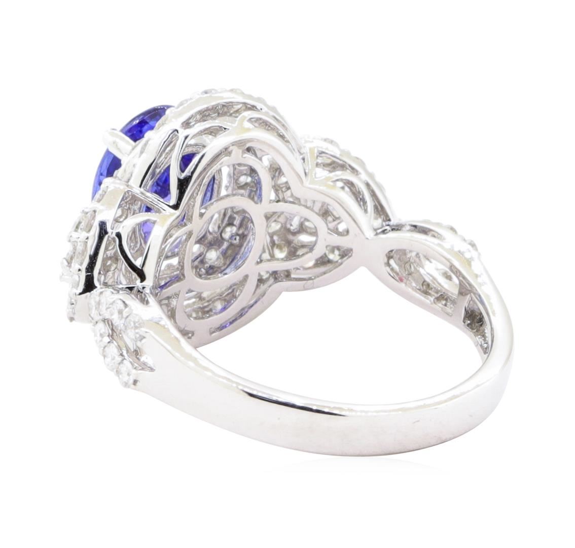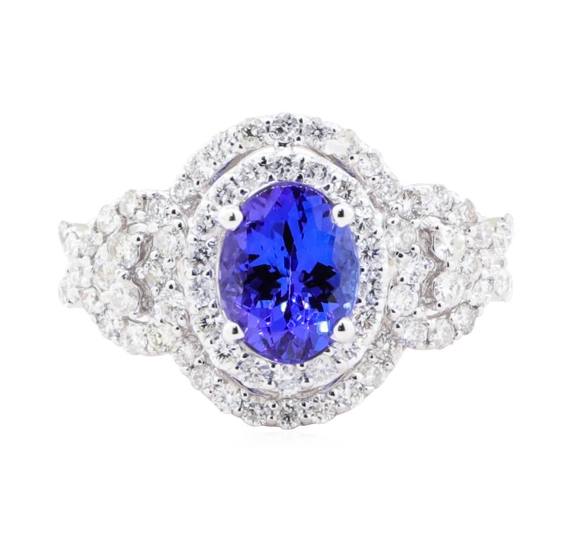 One electronically tested 18KT white gold lady's combination cast & assembled fashion ring with a double halo with a bright polish finish. The featured lady's ring has heart shaped accents and a shank measuring 2.70 millimeters wide. Identified with markings of '18K'. Condition is new, good workmanship. Containing: One prong set oval modified mixed cut natural tanzanite, measuring 8.50 x 6.55 x 4.63mm, (depth est.) approximate weight of 1.72ct., clarity is eye clean, medium dark, strong, violetish blue color, (GIA vB 6/5), cut is very good. Transmitting light with no distortion, transparent. Colored gemstones are presumed to have been subjected to commonly used enhancement processes. Graded in the setting. Eighty prong set round brilliant cut diamonds, measuring 1.60 - 1.50 x 0.96mm (depth est.) approximate total weight of 80 Stones = 1.15ct. Graded in the setting. Color H - I Clarity SI-1 to SI-3 Cut Good. Total Weight of Colored Stones 1.72ct.. Total Weight of Diamonds 1.15ct.. Total Weight of Ring 5.20gm GAS Appraised at $6155.00. GAS Appraised.