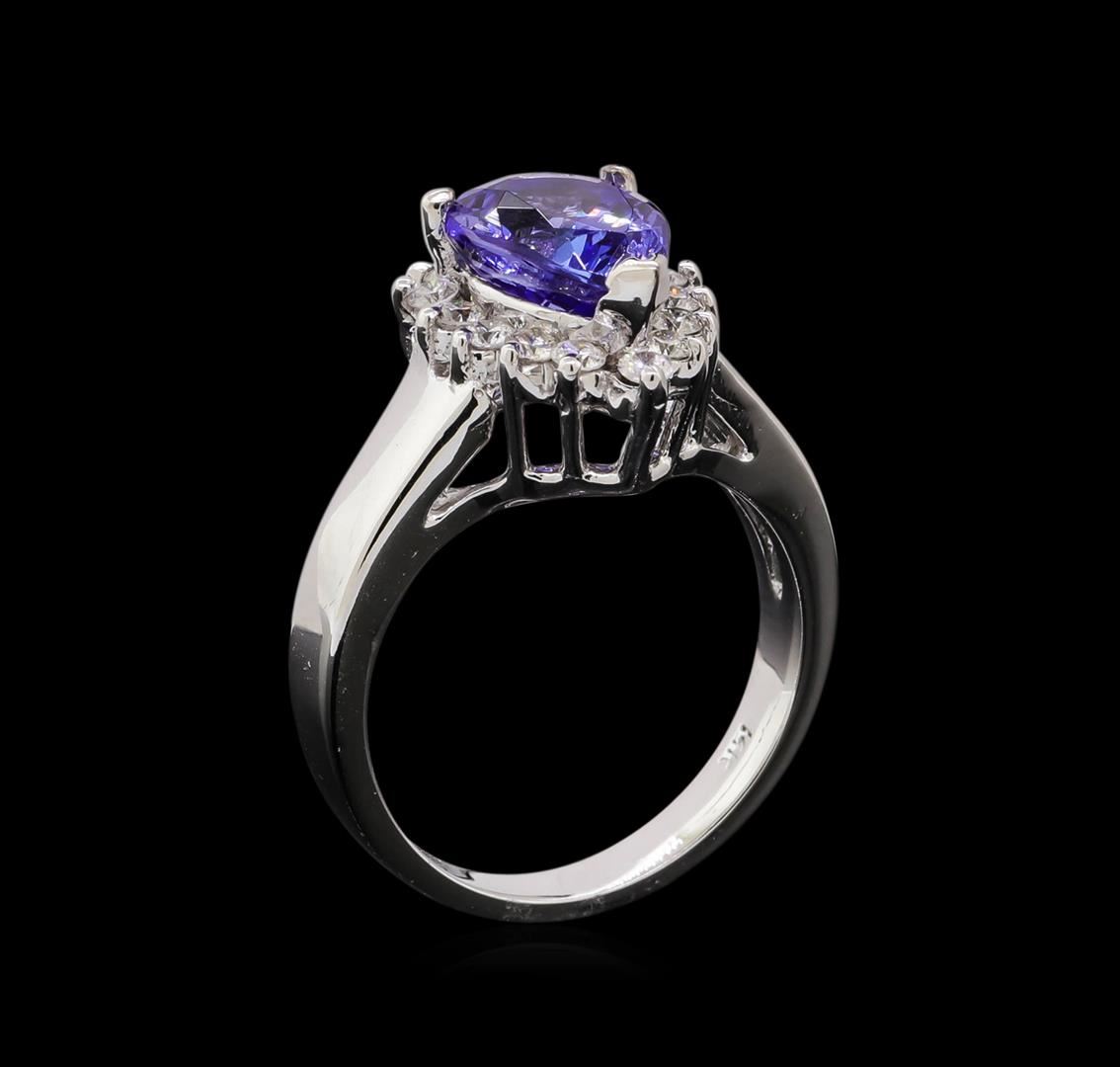 One electronically tested 14KT white gold lady's cast fashion ring with a basket halo with a bright polish finish. The featured lady's ring has a shank measuring 2.78 millimeters in width. Identified with markings of '14K'. Condition is new, good workmanship. Containing: One prong set pear modified brilliant cut natural tanzanite, measuring 10.50 x 7.85 x 5.51mm, (depth est.) approximate weight of 2.87ct., clarity is eye clean, medium dark, moderately strong, bluish violet color, (GIA bV 6/4), cut is very good. Transmitting light with no distortion, transparent. Colored gemstones are presumed to have been subjected to commonly used enhancement processes. Graded in the setting. Fifteen prong set round brilliant cut diamonds, measuring 2.10 - 2.00 x 1.25mm (depth est.) approximate total weight of 15 Stones = 0.48ct. Graded in the setting. Clarity SI-1 to SI-2. Color: H - I Cut Good. Total Weight of Colored Stones 2.87ct.. Total Weight of Diamonds 0.48ct.. Total Weight of Ring 6.90gm. GAS Appraised at $6,505.00.
