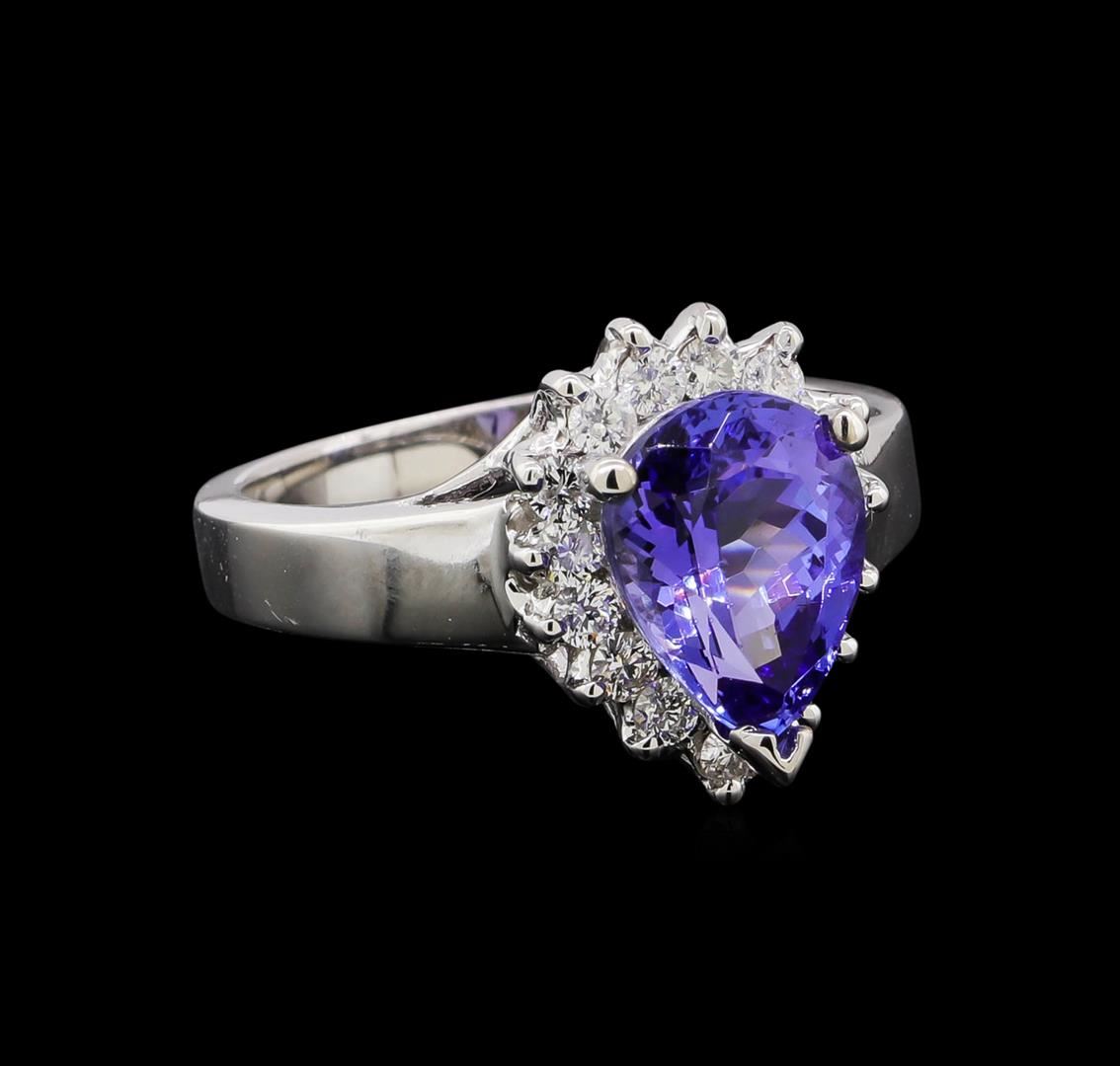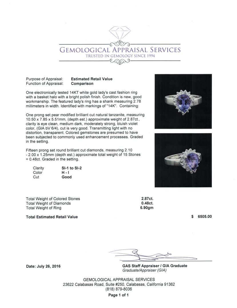 One electronically tested 14KT white gold lady's cast fashion ring with a basket halo with a bright polish finish. The featured lady's ring has a shank measuring 2.78 millimeters in width. Identified with markings of '14K'. Condition is new, good workmanship. Containing: One prong set pear modified brilliant cut natural tanzanite, measuring 10.50 x 7.85 x 5.51mm, (depth est.) approximate weight of 2.87ct., clarity is eye clean, medium dark, moderately strong, bluish violet color, (GIA bV 6/4), cut is very good. Transmitting light with no distortion, transparent. Colored gemstones are presumed to have been subjected to commonly used enhancement processes. Graded in the setting. Fifteen prong set round brilliant cut diamonds, measuring 2.10 - 2.00 x 1.25mm (depth est.) approximate total weight of 15 Stones = 0.48ct. Graded in the setting. Clarity SI-1 to SI-2. Color: H - I Cut Good. Total Weight of Colored Stones 2.87ct.. Total Weight of Diamonds 0.48ct.. Total Weight of Ring 6.90gm. GAS Appraised at $6,505.00.