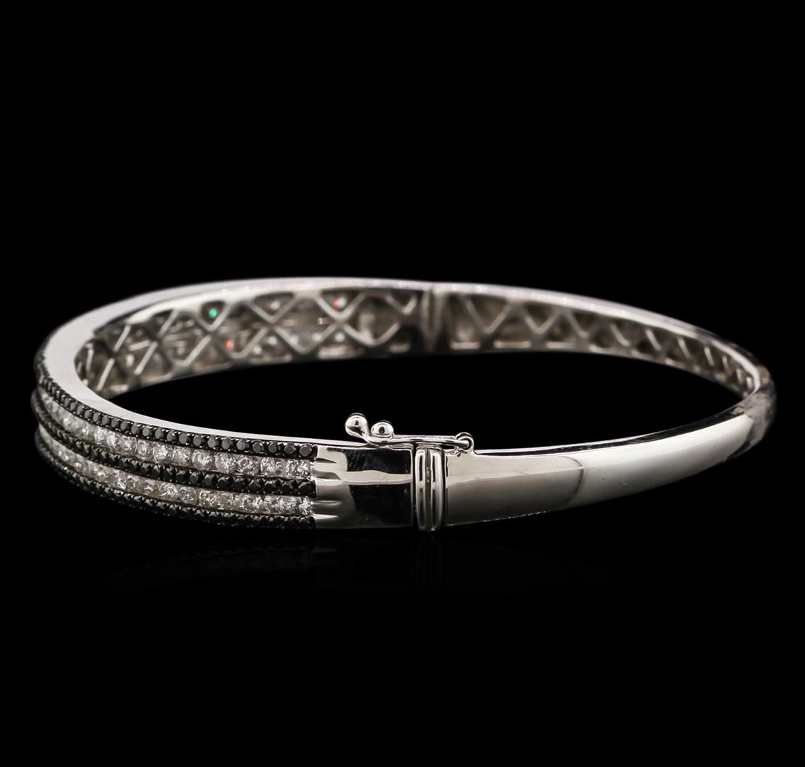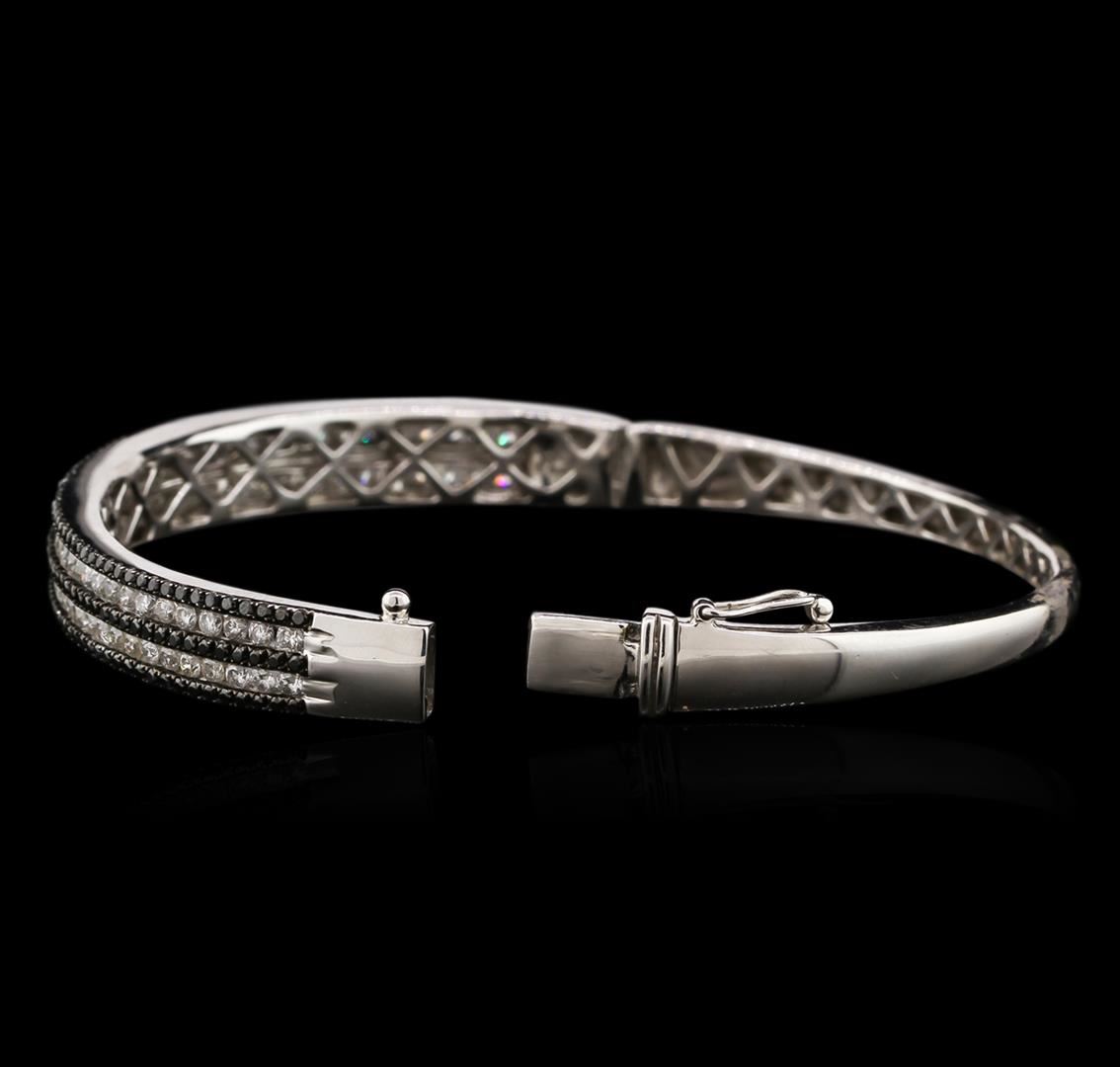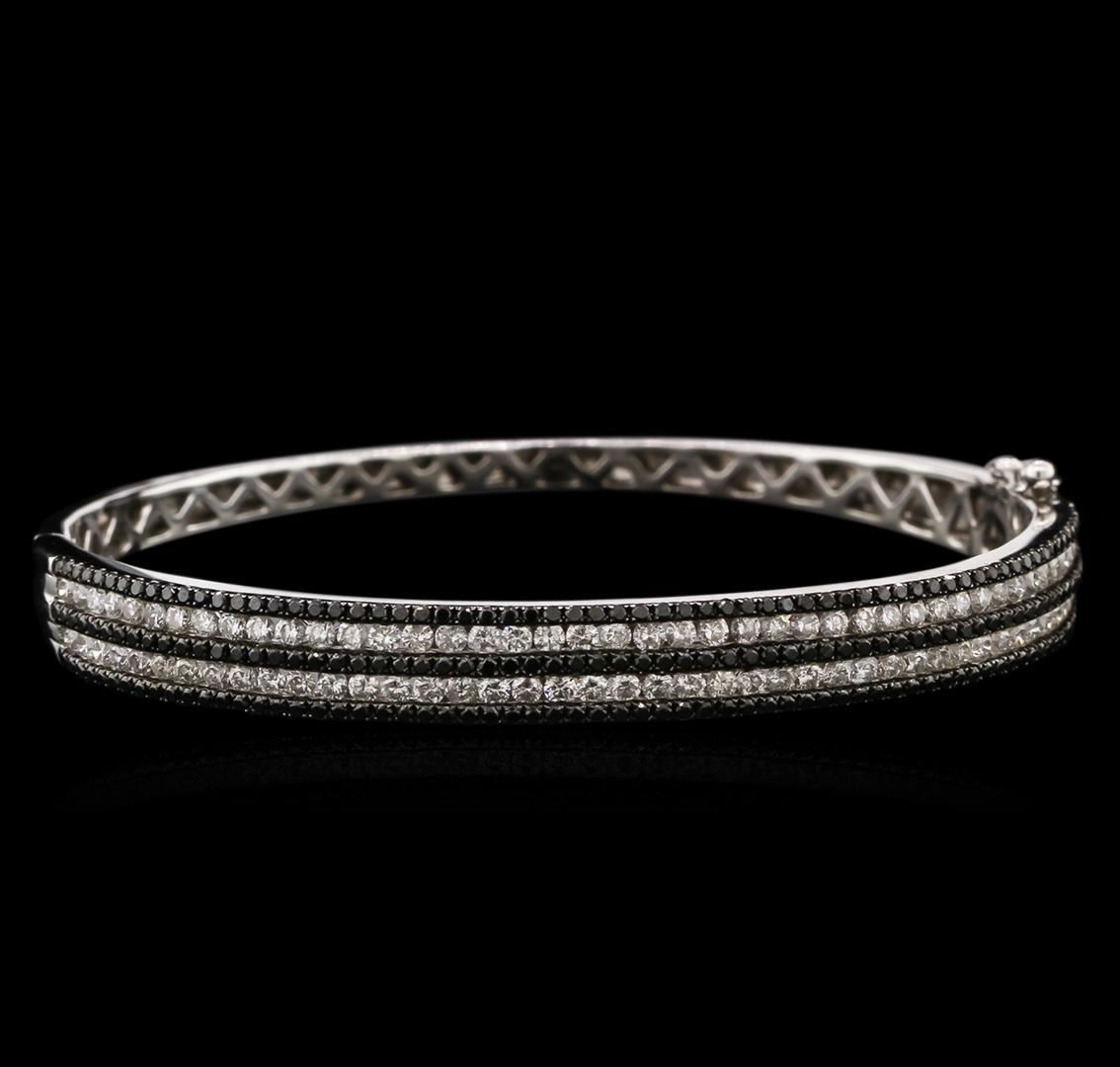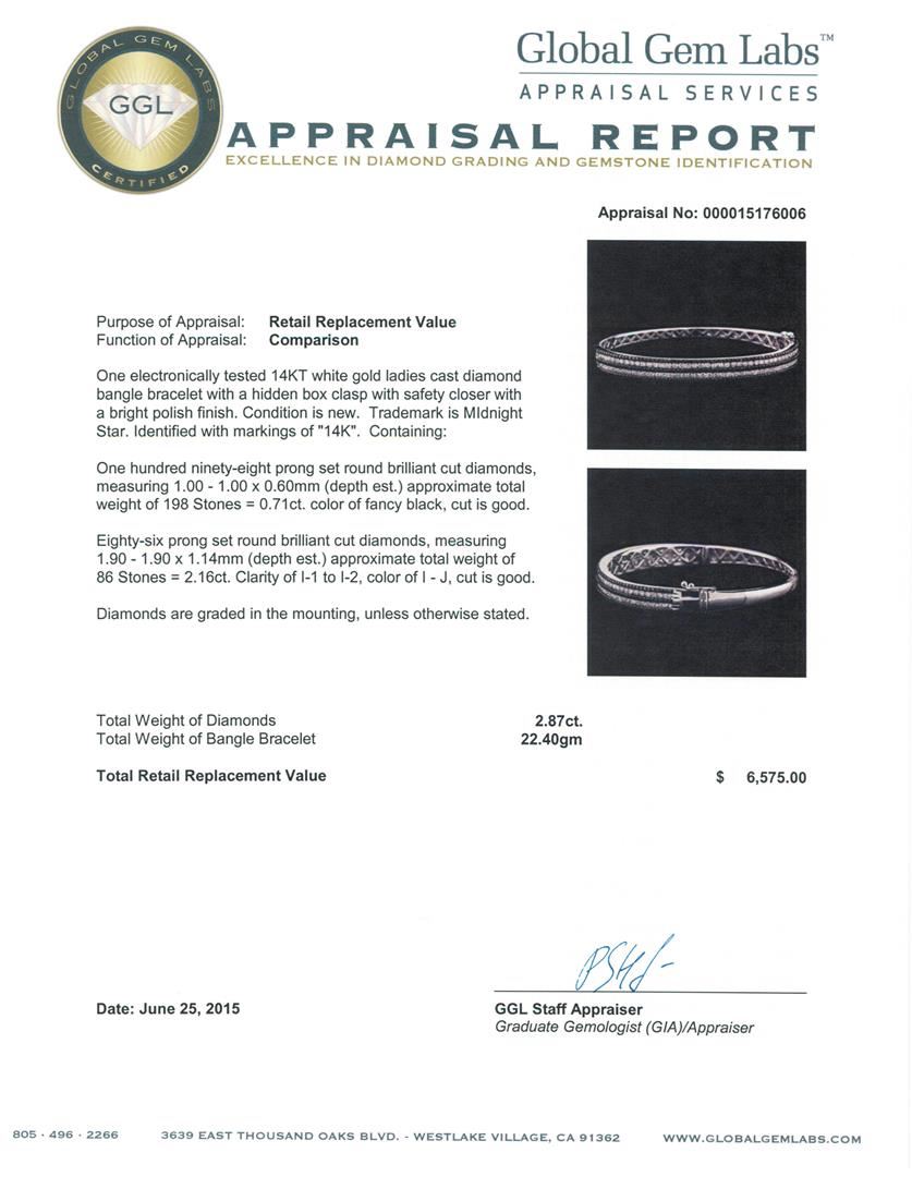 One electronically tested 14KT white gold ladies cast diamond bangle bracelet with a hidden box clasp with safety closer with a bright polish finish. Trademark is MIdnight Star. Identified with markings of "14K". Condition is new. Containing: One Hundred Ninety-Eight prong set round brilliant cut diamonds, measuring 1.00 - 1.00 x 0.60mm (depth est.) approximate total weight of 198 Stones = 0.71ct. Cut is Good. Eighty-Six prong set round brilliant cut diamonds, measuring 1.90 - 1.90 x 1.14mm (depth est.) approximate total weight of 86 Stones = 2.16ct. Clarity: I-1 to I-2. Color: I - J, Cut is Good. Diamonds are graded in the mounting, unless otherwise stated. Total Weight of Diamonds 2.87ct. Total Weight of Bangle Bracelet 22.40 grams. GGL Appraised at $6,575.00.