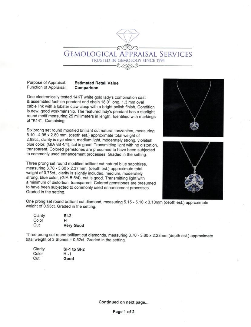 One electronically tested 14KT white gold lady's combination cast & assembled fashion pendant and chain 18.0" long, 1.3 mm oval cable link with a lobster claw clasp with a bright polish finish. The featured lady's pendant has a starlight round motif measuring 25 millimeters in length. Identified with markings of "K14". Condition is new, good workmanship. Containing: Six prong set round modified brilliant cut natural tanzanites, measuring 5.10 - 4.95 x 2.80 mm, (depth est.) approximate total weight of 2.88ct., clarity is eye clean, medium light, moderately strong, violetish blue color, (GIA vB 4/4), cut is good. Transmitting light with no distortion, transparent. Colored gemstones are presumed to have been subjected to commonly used enhancement processes. Graded in the setting. Three prong set round modified brilliant cut natural blue sapphires, measuring 3.70 - 3.60 x 2.37 mm, (depth est.) approximate total weight of 0.75ct., clarity is slightly included, medium, moderately strong, blue color, (GIA B 5/4), cut is good. Transmitting light with a minimum of distortion, transparent. Colored gemstones are presumed to have been subjected to commonly used enhancement processes. Graded in the setting. One prong set round brilliant cut diamond, measuring 5.15 - 5.10 x 3.13mm (depth est.) approximate weight of 0.53ct. Graded in the setting. Clarity: SI-2. Color: Very Good Three prong set round brilliant cut diamonds, measuring 3.70 - 3.60 x 2.23mm (depth est.) approximate total weight of 3 Stones = 0.52ct. Graded in the setting. Clarity: SI-1 to SI-2. Color: H - I. Cut Good Twelve prong set round brilliant cut diamonds, measuring 2.60 - 2.40 x 1.53mm (depth est.) approximate total weight of 12 Stones = 0.72ct. Graded in the setting. Clarity: SI-1 to SI-2. Color: H - I. Cut Good. Total Weight of Colored Stones 3.63ct. Total Weight of Diamonds 1.77ct. Total Weight of Pendant And Chain 10.90gm. GAS Appraised at $11,405.00.
