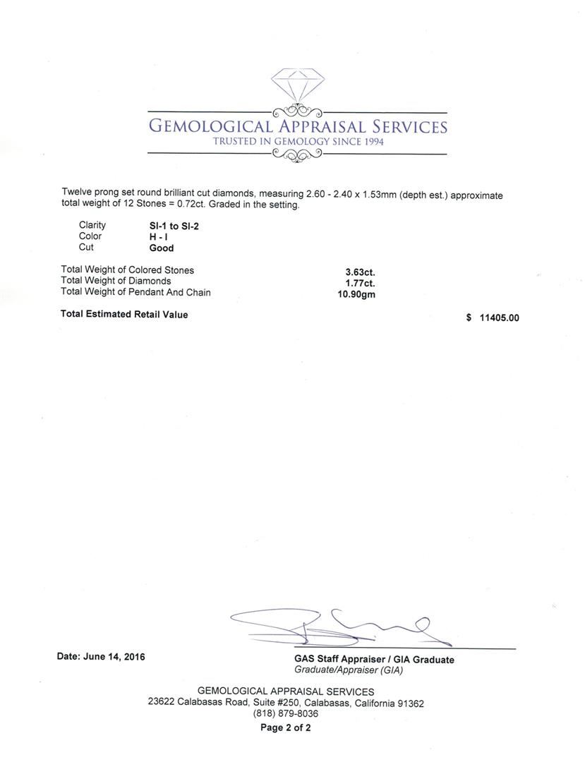 One electronically tested 14KT white gold lady's combination cast & assembled fashion pendant and chain 18.0" long, 1.3 mm oval cable link with a lobster claw clasp with a bright polish finish. The featured lady's pendant has a starlight round motif measuring 25 millimeters in length. Identified with markings of "K14". Condition is new, good workmanship. Containing: Six prong set round modified brilliant cut natural tanzanites, measuring 5.10 - 4.95 x 2.80 mm, (depth est.) approximate total weight of 2.88ct., clarity is eye clean, medium light, moderately strong, violetish blue color, (GIA vB 4/4), cut is good. Transmitting light with no distortion, transparent. Colored gemstones are presumed to have been subjected to commonly used enhancement processes. Graded in the setting. Three prong set round modified brilliant cut natural blue sapphires, measuring 3.70 - 3.60 x 2.37 mm, (depth est.) approximate total weight of 0.75ct., clarity is slightly included, medium, moderately strong, blue color, (GIA B 5/4), cut is good. Transmitting light with a minimum of distortion, transparent. Colored gemstones are presumed to have been subjected to commonly used enhancement processes. Graded in the setting. One prong set round brilliant cut diamond, measuring 5.15 - 5.10 x 3.13mm (depth est.) approximate weight of 0.53ct. Graded in the setting. Clarity: SI-2. Color: Very Good Three prong set round brilliant cut diamonds, measuring 3.70 - 3.60 x 2.23mm (depth est.) approximate total weight of 3 Stones = 0.52ct. Graded in the setting. Clarity: SI-1 to SI-2. Color: H - I. Cut Good Twelve prong set round brilliant cut diamonds, measuring 2.60 - 2.40 x 1.53mm (depth est.) approximate total weight of 12 Stones = 0.72ct. Graded in the setting. Clarity: SI-1 to SI-2. Color: H - I. Cut Good. Total Weight of Colored Stones 3.63ct. Total Weight of Diamonds 1.77ct. Total Weight of Pendant And Chain 10.90gm. GAS Appraised at $11,405.00.