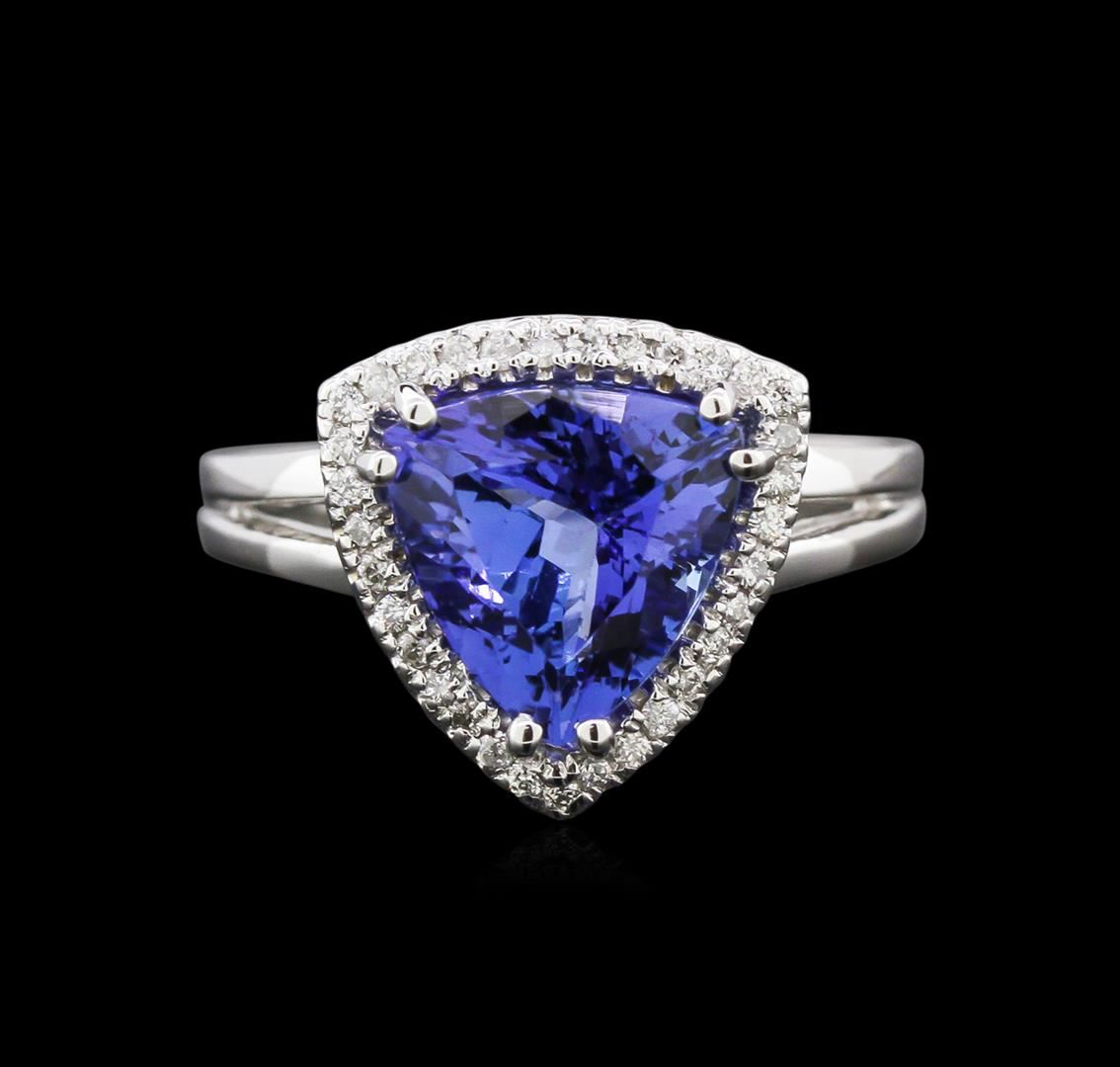 One stamped & tested 14KT white gold lady's cast cocktail ring with a split shank with a bright polish finish. Condition is new. Containing: One prong set triangle modified brilliant cut natural tanzanite, measuring 9.45 x 9.16 x 5.57mm, approximate weight of 2.88ct., clarity is eye clean, type I, medium dark, very slightly grayish, bluish violet color, (GIA bV 6/3), cut is very good. Thirty-four prong set round brilliant cut diamonds, measuring 1.10 - 1.00 x 0.63mm (depth est.) approximate total weight of 34 Stones = 0.15ct. Clarity: SI-1 to I-1. Color: H - I. Cut: Good. Total Weight of Colored Stones: 2.88ct. Total Weight of Diamonds: 0.15ct. Total Weight of Ring: 3.90 gm. GAS Appraised at $5,475.00.