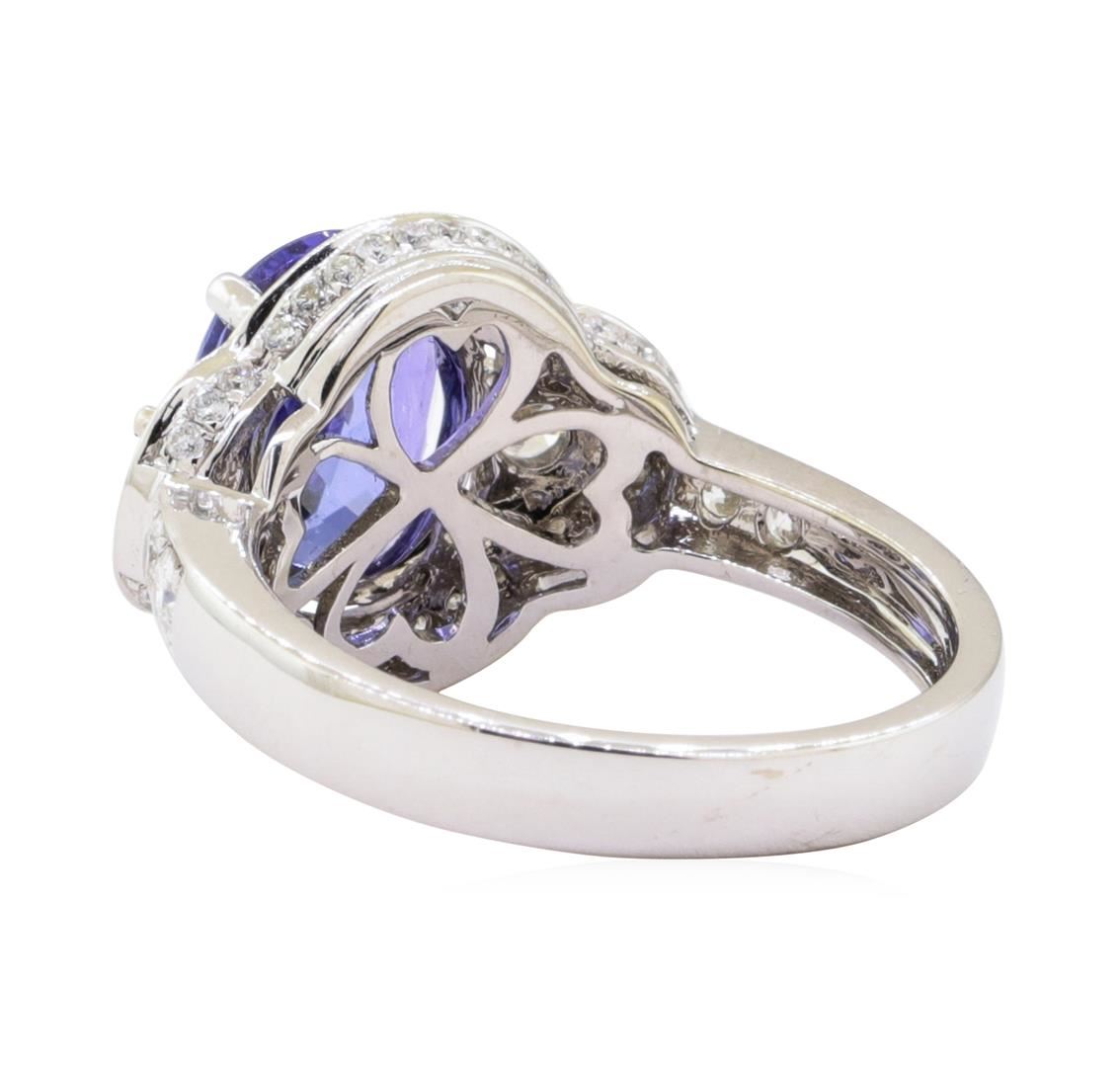One electronically tested 14KT white gold ladies cast & assembled tanzanite & diamond ring. The featured tanzanite is set within a diamond bezel between mirroring diamond galleries, supported by a lattice under gallery and diamond set shoulders, completed by a three millimeter wide band. Bright polish ?nish. Identi?ed with markings of "l4K". Condition is new, good workmanship. Containing: One prong set oval modi?ed brilliant cut natural tanzanite, measuring 10.00 x 7.00 x 5.80mm, exact weight 2.88ct., clarity is eye clean, type I, medium dark, very slightly grayish, bluish violet color, (GIA bV 6/3), cut is good. Transmitting light with no distortion, transparent. Graded in the setting. Tanzanite is a very rare gemstone that is only found in the country of Tanzania. Originally discovered in 1967. Tiffany & Company, named the stone Tanzanite. It is found in the Usumburu Mountains that border the Umba Valley of northern Tanzania. Tanzanite occurs in gray, brown, violet, blue, reddish-purple, & green. The gem is interesting because of its exceptional pleochroism. Rotated in different directions a tanzanite will exhibit multiple changes of color. Tanzanite has a low tolerance to ultrasonic cleaning, and should not be cleaned using this method. Seventy-Two prong set round brilliant cut diamonds exact total weight 72 Stones = 0.7 4ct. Graded in the setting. Clarity SI-3 to I-2 Color F - H Total Weight of Colored Stones 2.88 ct. Total Weight of Diamonds 0.74 ct. Total Weight of Ring 5.30 gm Estimated Retail Value $ 9,190.00 US