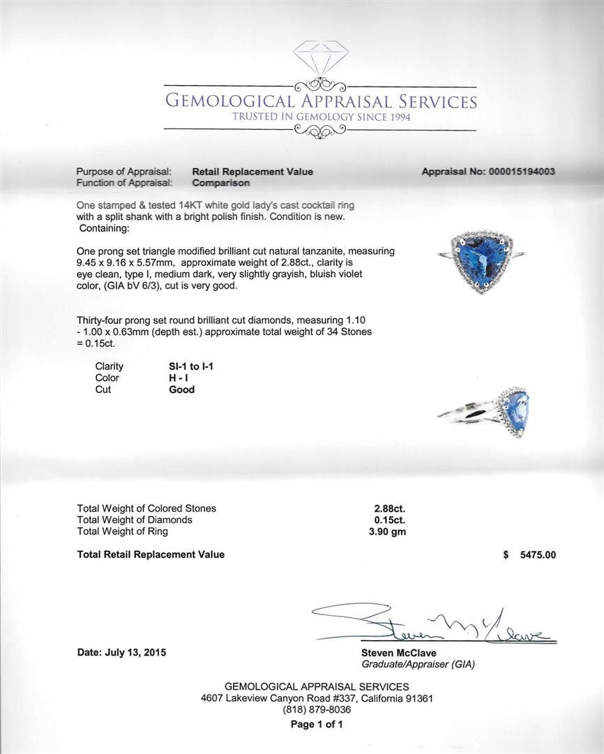 One stamped & tested 14KT white gold lady's cast cocktail ring with a split shank with a bright polish finish. Condition is new. Containing: One prong set triangle modified brilliant cut natural tanzanite, measuring 9.45 x 9.16 x 5.57mm, approximate weight of 2.88ct., clarity is eye clean, type I, medium dark, very slightly grayish, bluish violet color, (GIA bV 6/3), cut is very good. Thirty-four prong set round brilliant cut diamonds, measuring 1.10 - 1.00 x 0.63mm (depth est.) approximate total weight of 34 Stones = 0.15ct. Clarity: SI-1 to I-1. Color: H - I. Cut: Good. Total Weight of Colored Stones: 2.88ct. Total Weight of Diamonds: 0.15ct. Total Weight of Ring: 3.90 gm. GAS Appraised at $5,475.00.