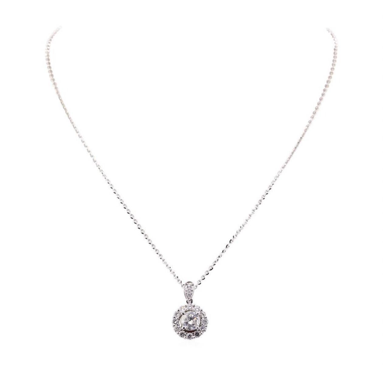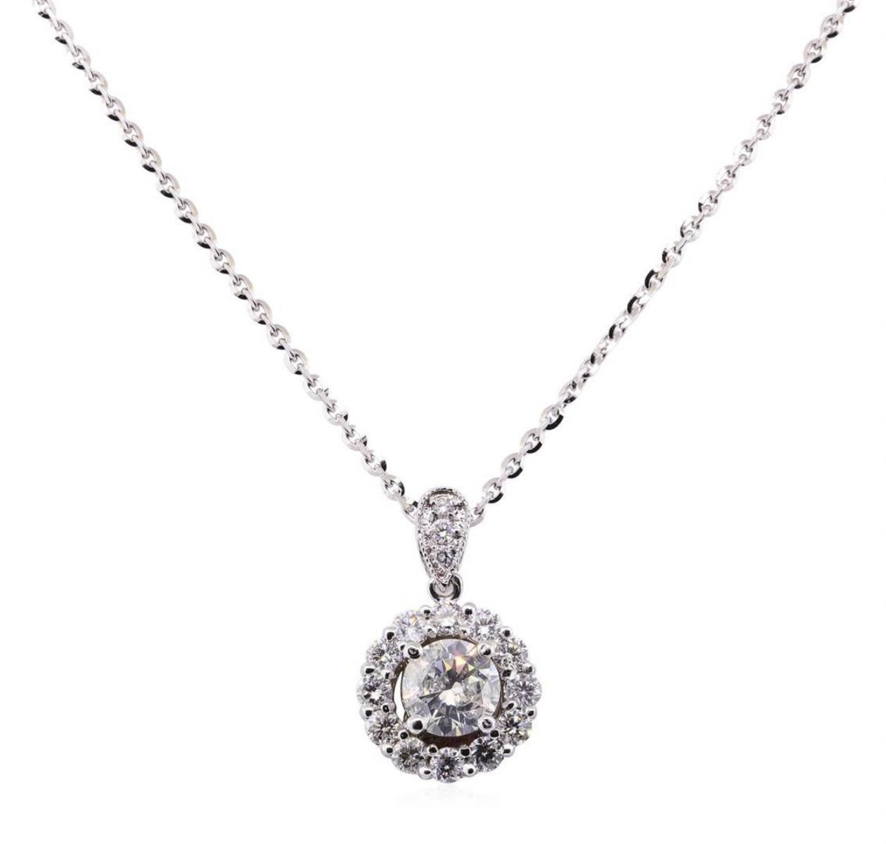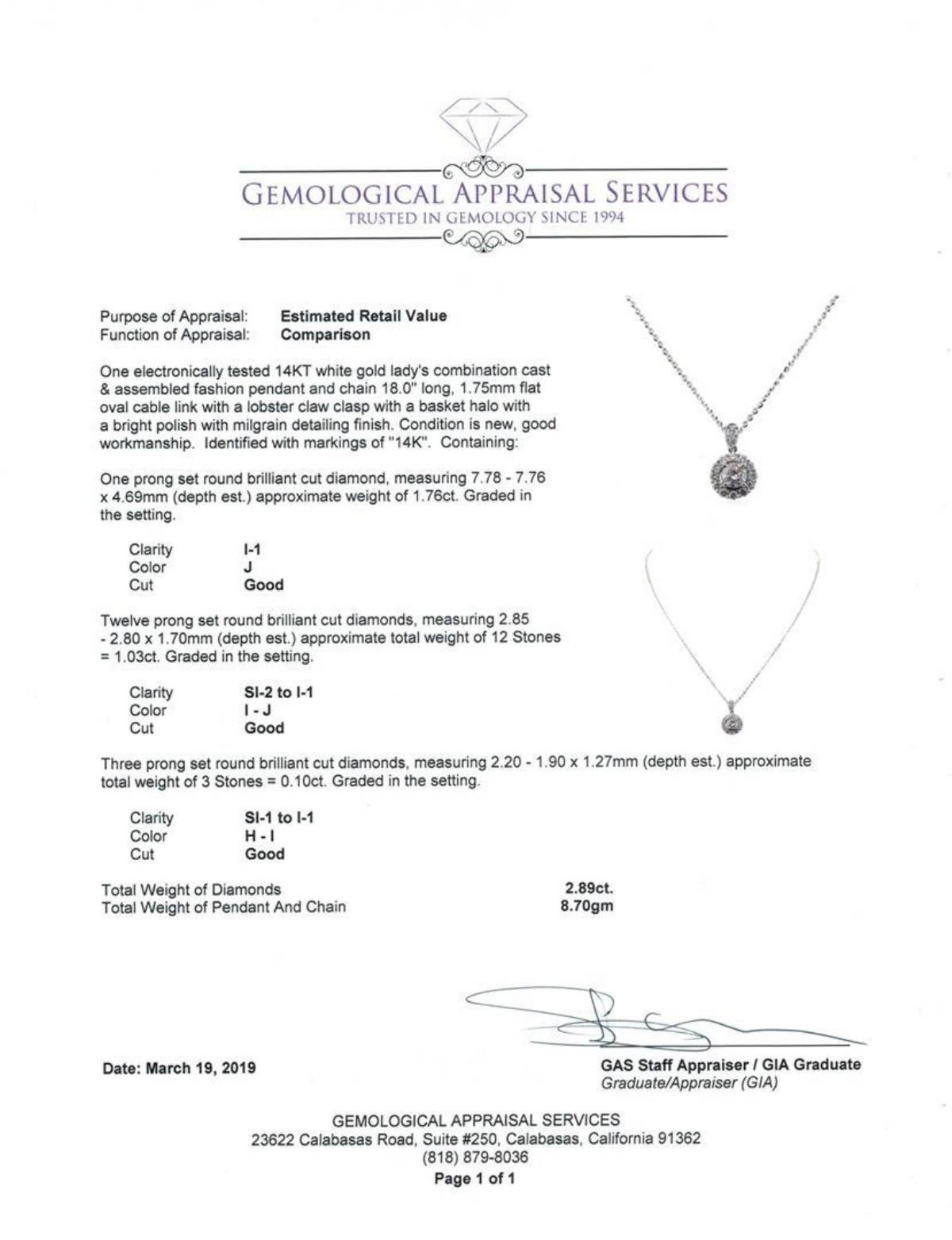 One electronically tested 14KT white gold lady's combination cast & assembled fashion pendant and chain 18.0' long, 1.75mm flat oval cable link with a lobster claw clasp with a basket halo with a bright polish with milgrain detailing finish. Identified with markings of '14K'. Condition is new, good workmanship. Containing: One prong set round brilliant cut diamond, measuring 7.78 - 7.76 x 4.69mm (depth est.) approximate weight of 1.76ct. Graded in the setting. Color J Clarity I-1 Cut Good Twelve prong set round brilliant cut diamonds, measuring 2.85 - 2.80 x 1.70mm (depth est.) approximate total weight of 12 Stones = 1.03ct. Graded in the setting. Color I - J Clarity SI-2 to I-1 Cut Good Three prong set round brilliant cut diamonds, measuring 2.20 - 1.90 x 1.27mm (depth est.) approximate total weight of 3 Stones = 0.10ct. Graded in the setting. Color H - I Clarity SI-1 to I-1 Cut Good. Total Weight of Diamonds 2.89ct.. Total Weight of Pendant And Chain 8.70gm GAS Appraised at $13185.00. GAS Appraised.