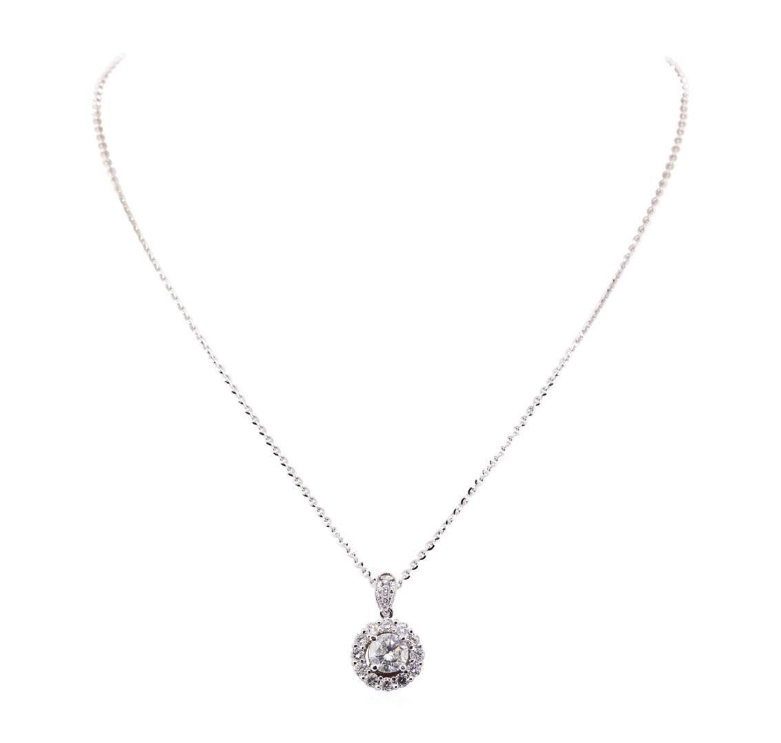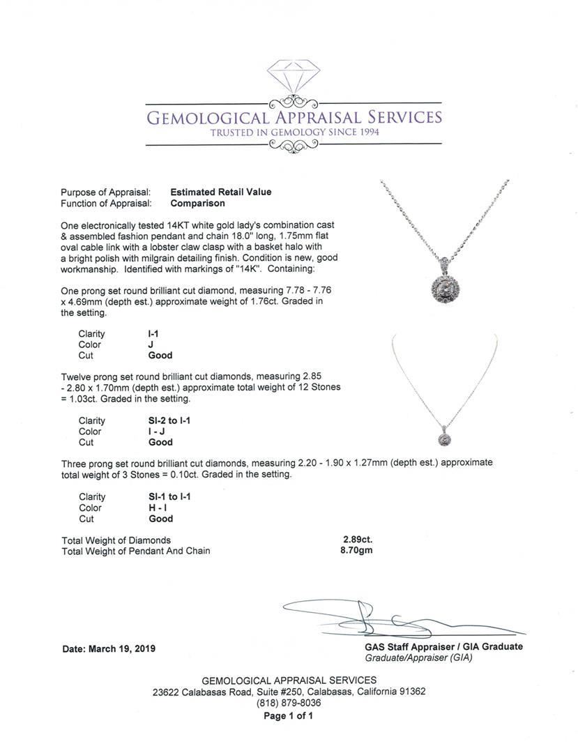 One electronically tested 14KT white gold lady's combination cast & assembled fashion pendant and chain 18.0' long, 1.75mm flat oval cable link with a lobster claw clasp with a basket halo with a bright polish with milgrain detailing finish. Identified with markings of '14K'. Condition is new, good workmanship. Containing: One prong set round brilliant cut diamond, measuring 7.78 - 7.76 x 4.69mm (depth est.) approximate weight of 1.76ct. Graded in the setting. Color J Clarity I-1 Cut Good Twelve prong set round brilliant cut diamonds, measuring 2.85 - 2.80 x 1.70mm (depth est.) approximate total weight of 12 Stones = 1.03ct. Graded in the setting. Color I - J Clarity SI-2 to I-1 Cut Good Three prong set round brilliant cut diamonds, measuring 2.20 - 1.90 x 1.27mm (depth est.) approximate total weight of 3 Stones = 0.10 ct. Graded in the setting. Color H - I Clarity SI-1 to I-1 Cut Good. Total Weight of Diamonds 2.89ct.. Total Weight of Pendant And Chain 8.70gm GAS Appraised at $13185.00. GAS Appraised.