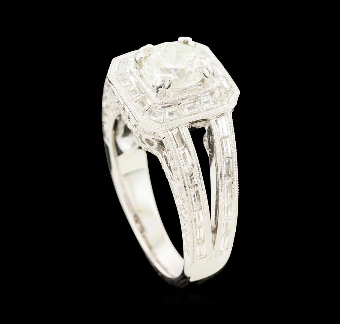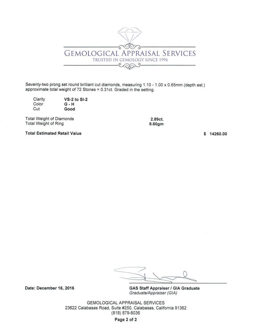 One electronically tested 18KT white gold lady's cast wedding ring with a split cathedral shank with a halo with a bright polish with milgrain detailing finish. The featured lady's ring has a filigree detailed under gallery and a shank measuring 2.95 millimeters wide. Identified with markings of '18K 750'. Condition is new, good workmanship. Containing: One prong set round brilliant cut diamond, measuring 6.44 - 6.39 x 4.13mm (depth est.) , 5.00.%. GTCF approximate weight of 1.12ct. Graded in the setting. Clarity I-1. Color: H - I Cut Very Good Sixteen channel set step trapezoid cut diamonds, measuring 2.30 x 1.80 x 1.44mm (depth est.) approximate total weight of 16 Stones = 0.61ct. Graded in the setting. Clarity VS-1 to VS-2. Color: G - H Cut Very Good Twenty-Eight channel set baguette cut diamonds, measuring from 2.10 x 1.10 x 0.94mm (depth est.) to 2.30 x 1.20 x 1.02mm (depth est.) , 10.00.%. GTCF approximate total weight of 28 Stones = 0.70ct. Graded in the setting. Clarity VS-1 to VS-2. Color: F - G Cut Very Good Sixteen prong set round brilliant cut diamonds, measuring 1.40 - 1.30 x 0.84mm (depth est.) approximate total weight of 16 Stones = 0.15ct. Graded in the setting. Clarity VS-2 to SI-1. Color: G - H Cut Good Seventy-Two prong set round brilliant cut diamonds, measuring 1.10 - 1.00 x 0.65mm (depth est.) approximate total weight of 72 Stones = 0.31ct. Graded in the setting. Clarity VS-2 to SI-2. Color: G - H Cut Good. Total Weight of Diamonds 2.89ct.. Total Weight of Ring 8.60gm. GAS Appraised at $14,260.00.