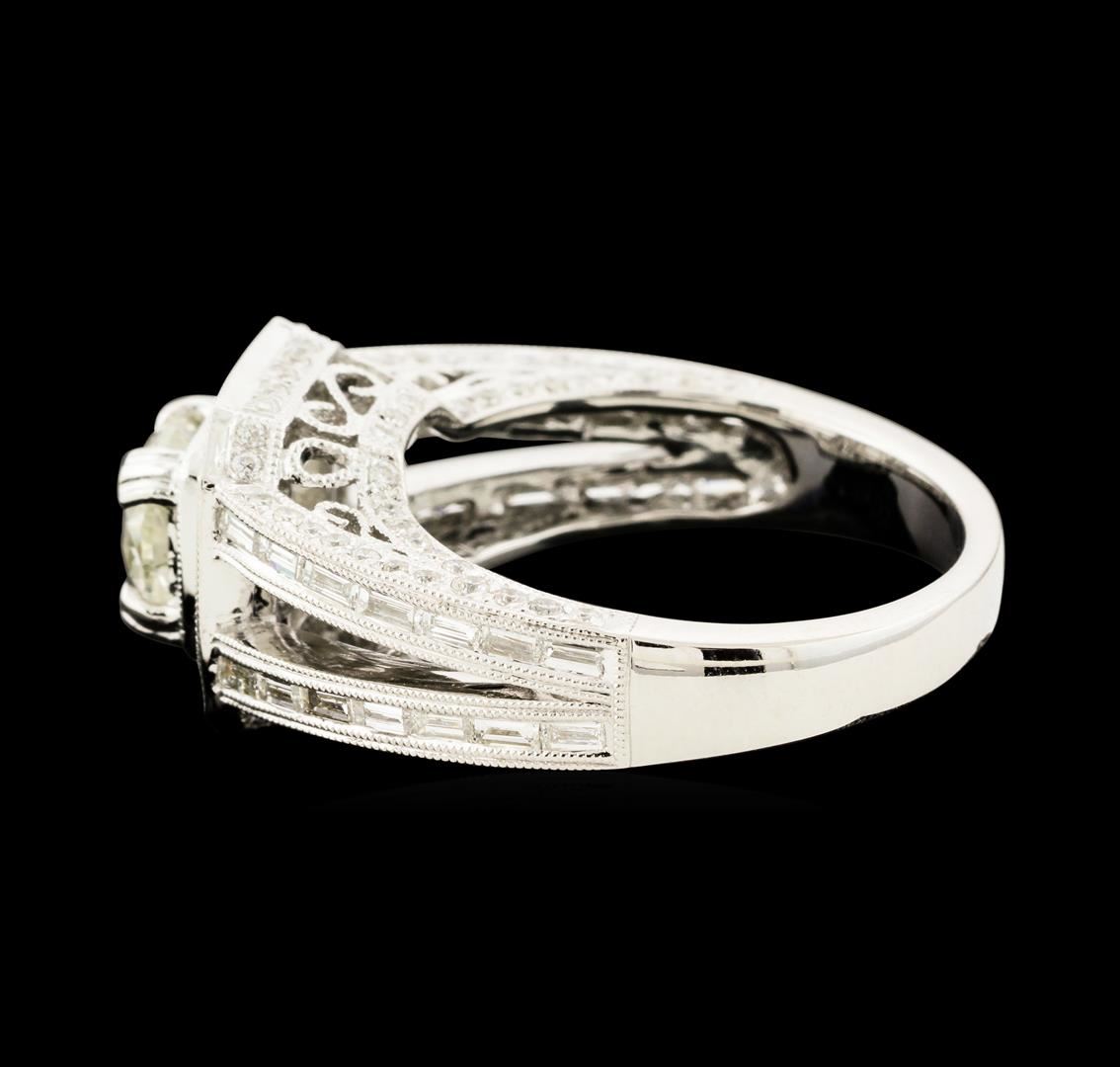 One electronically tested 18KT white gold lady's cast wedding ring with a split cathedral shank with a halo with a bright polish with milgrain detailing finish. The featured lady's ring has a filigree detailed under gallery and a shank measuring 2.95 millimeters wide. Identified with markings of '18K 750'. Condition is new, good workmanship. Containing: One prong set round brilliant cut diamond, measuring 6.44 - 6.39 x 4.13mm (depth est.) , 5.00.%. GTCF approximate weight of 1.12ct. Graded in the setting. Clarity I-1. Color: H - I Cut Very Good Sixteen channel set step trapezoid cut diamonds, measuring 2.30 x 1.80 x 1.44mm (depth est.) approximate total weight of 16 Stones = 0.61ct. Graded in the setting. Clarity VS-1 to VS-2. Color: G - H Cut Very Good Twenty-Eight channel set baguette cut diamonds, measuring from 2.10 x 1.10 x 0.94mm (depth est.) to 2.30 x 1.20 x 1.02mm (depth est.) , 10.00.%. GTCF approximate total weight of 28 Stones = 0.70ct. Graded in the setting. Clarity VS-1 to VS-2. Color: F - G Cut Very Good Sixteen prong set round brilliant cut diamonds, measuring 1.40 - 1.30 x 0.84mm (depth est.) approximate total weight of 16 Stones = 0.15ct. Graded in the setting. Clarity VS-2 to SI-1. Color: G - H Cut Good Seventy-Two prong set round brilliant cut diamonds, measuring 1.10 - 1.00 x 0.65mm (depth est.) approximate total weight of 72 Stones = 0.31ct. Graded in the setting. Clarity VS-2 to SI-2. Color: G - H Cut Good. Total Weight of Diamonds 2.89ct.. Total Weight of Ring 8.60gm. GAS Appraised at $14,260.00.