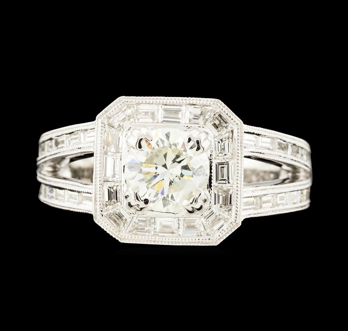 One electronically tested 18KT white gold lady's cast wedding ring with a split cathedral shank with a halo with a bright polish with milgrain detailing finish. The featured lady's ring has a filigree detailed under gallery and a shank measuring 2.95 millimeters wide. Identified with markings of '18K 750'. Condition is new, good workmanship. Containing: One prong set round brilliant cut diamond, measuring 6.44 - 6.39 x 4.13mm (depth est.) , 5.00.%. GTCF approximate weight of 1.12ct. Graded in the setting. Clarity I-1. Color: H - I Cut Very Good Sixteen channel set step trapezoid cut diamonds, measuring 2.30 x 1.80 x 1.44mm (depth est.) approximate total weight of 16 Stones = 0.61ct. Graded in the setting. Clarity VS-1 to VS-2. Color: G - H Cut Very Good Twenty-Eight channel set baguette cut diamonds, measuring from 2.10 x 1.10 x 0.94mm (depth est.) to 2.30 x 1.20 x 1.02mm (depth est.) , 10.00.%. GTCF approximate total weight of 28 Stones = 0.70ct. Graded in the setting. Clarity VS-1 to VS-2. Color: F - G Cut Very Good Sixteen prong set round brilliant cut diamonds, measuring 1.40 - 1.30 x 0.84mm (depth est.) approximate total weight of 16 Stones = 0.15ct. Graded in the setting. Clarity VS-2 to SI-1. Color: G - H Cut Good Seventy-Two prong set round brilliant cut diamonds, measuring 1.10 - 1.00 x 0.65mm (depth est.) approximate total weight of 72 Stones = 0.31ct. Graded in the setting. Clarity VS-2 to SI-2. Color: G - H Cut Good. Total Weight of Diamonds 2.89ct.. Total Weight of Ring 8.60gm. GAS Appraised at $14,260.00.