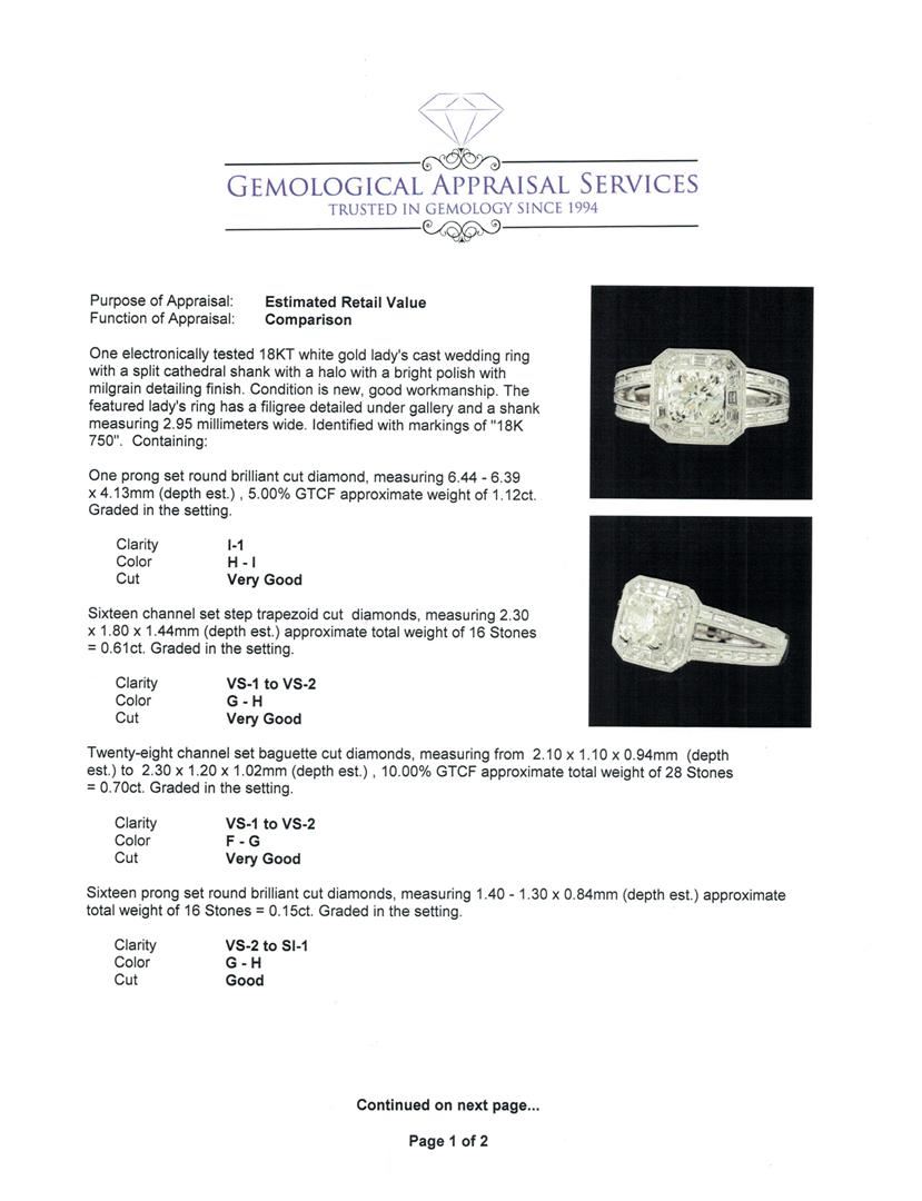 One electronically tested 18KT white gold lady's cast wedding ring with a split cathedral shank with a halo with a bright polish with milgrain detailing finish. The featured lady's ring has a filigree detailed under gallery and a shank measuring 2.95 millimeters wide. Identified with markings of '18K 750'. Condition is new, good workmanship. Containing: One prong set round brilliant cut diamond, measuring 6.44 - 6.39 x 4.13mm (depth est.) , 5.00.%. GTCF approximate weight of 1.12ct. Graded in the setting. Clarity I-1. Color: H - I Cut Very Good Sixteen channel set step trapezoid cut diamonds, measuring 2.30 x 1.80 x 1.44mm (depth est.) approximate total weight of 16 Stones = 0.61ct. Graded in the setting. Clarity VS-1 to VS-2. Color: G - H Cut Very Good Twenty-Eight channel set baguette cut diamonds, measuring from 2.10 x 1.10 x 0.94mm (depth est.) to 2.30 x 1.20 x 1.02mm (depth est.) , 10.00.%. GTCF approximate total weight of 28 Stones = 0.70ct. Graded in the setting. Clarity VS-1 to VS-2. Color: F - G Cut Very Good Sixteen prong set round brilliant cut diamonds, measuring 1.40 - 1.30 x 0.84mm (depth est.) approximate total weight of 16 Stones = 0.15ct. Graded in the setting. Clarity VS-2 to SI-1. Color: G - H Cut Good Seventy-Two prong set round brilliant cut diamonds, measuring 1.10 - 1.00 x 0.65mm (depth est.) approximate total weight of 72 Stones = 0.31ct. Graded in the setting. Clarity VS-2 to SI-2. Color: G - H Cut Good. Total Weight of Diamonds 2.89ct.. Total Weight of Ring 8.60gm. GAS Appraised at $14,260.00.